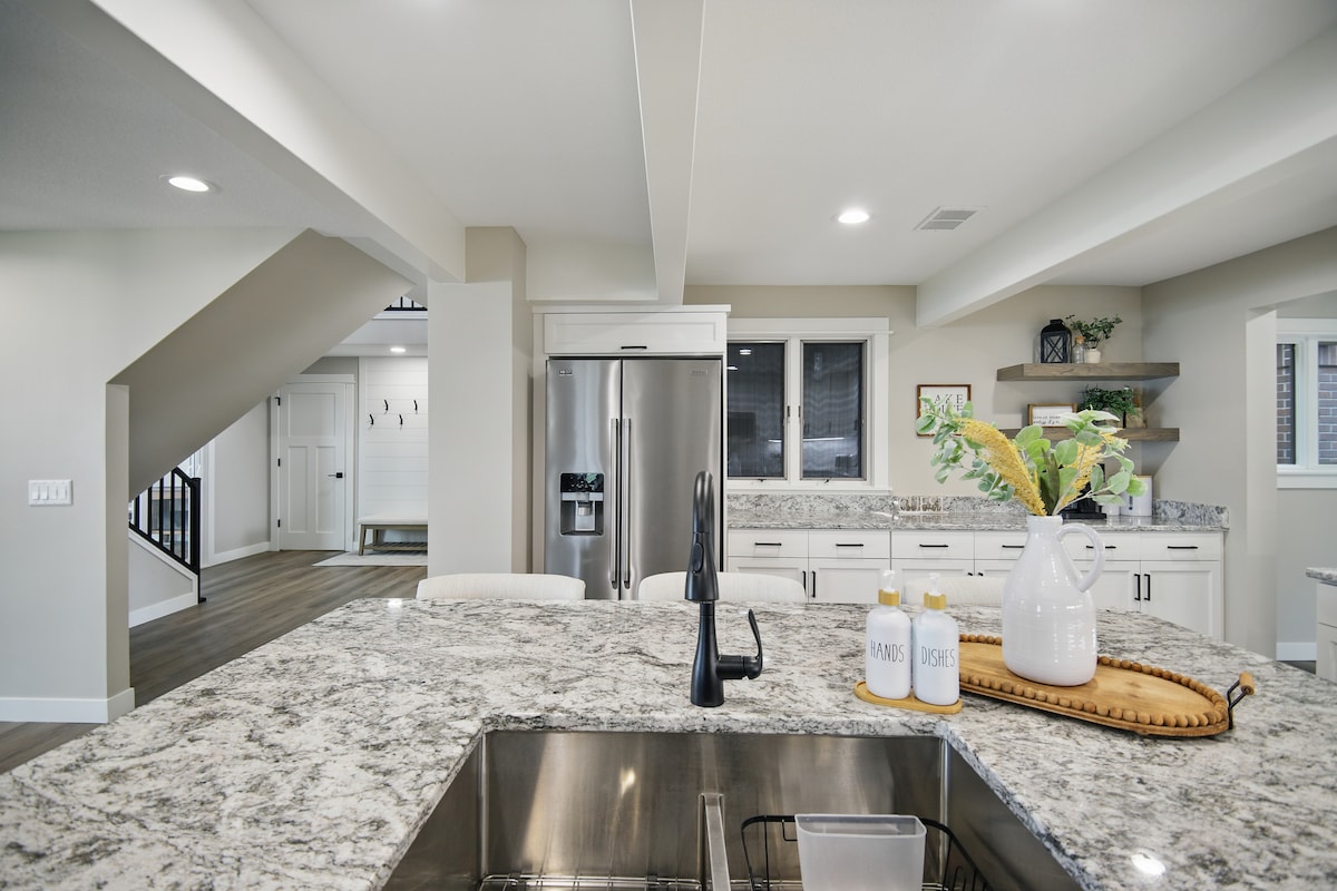Welcome to Phil’s Place - modern luxury welcomes you from the outdoor walking path network, adjacent park and ponds, and hot tub (promo=FREE!) All new interior, heated bathroom floor, 3 head shower system with rain-head, kitchenette with granite tops - complimentary wine and water available upon request , gas fireplace, luxury mattresses, 65” Sony app loaded TV, top grain leather sectional with 3 reclining sections will refresh and renew you for the next adventure! Immaculate-see reviews!ay