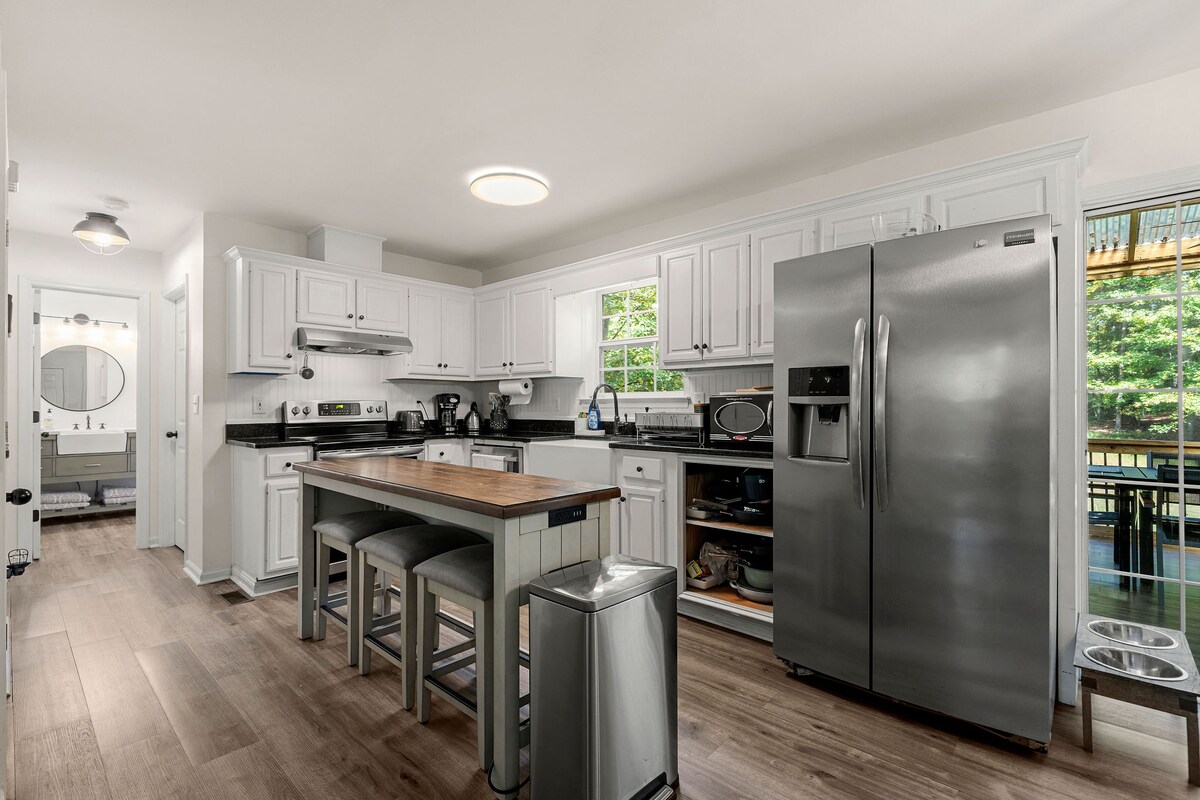 Retragere cu tot ce ai nevoie. Casă complet mobilată și proiectată cu gust, cu 3 dormitoare, pe o proprietate privată liniștită de 1 acru, la o scurtă plimbare de 5 minute de un doc comun pentru bărci. Locuința are toate facilitățile pentru o escapadă perfectă. Bucură-te de noua noastră saună cu butoaie (în plus Se aplică o taxă), foc de tabără seara sau pur și simplu bucură-te de vizitarea faunei sălbatice. Închiriază o barcă și explorează lacul Lanier sau relaxează-te lângă piscină. Excelent pentru familii și pentru cei care doresc să evadeze pentru a se reîncărca. * PISCINA SE ÎNCHIDE LA SFÂRȘITUL LUNII SEPTEMBRIE, SE DESCHIDE ÎN MAI!!