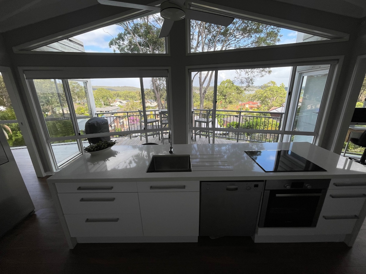 Amplasat pe deal într-o suburbie pe malul lacului de est Macquarie, Newcastle - în centrul lacului Macquarie și Newcastle, la 15 minute de capătul M1 (ieșirea Swansea) - Lake Views și câteva minute de mers pe jos până la lac sau Bush Tracks Casă modernizată pe partea laterală a dealului, rampă de intrare plană până la ușa din față. Dormitor principal, cu baie privată cu vedere la lac. Bucură-te de această locuință pe două niveluri, 3 livinguri, sufragerie și bucătărie cu balcon și masă în aer liber Weber pentru luat masa în copac și vedere la lac