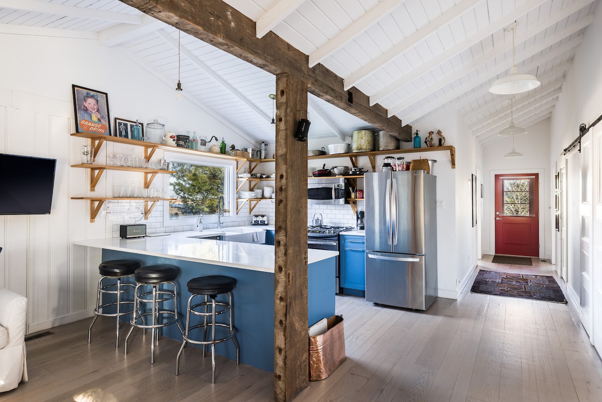 Spacious house right on Fort Pond with relaxed bohemian vibe. Enjoy the open kitchen, reclaimed wood beams, and hand crafted furniture. Access directly to the water from the back yard. There are two other cottages that are two bedrooms each on property as well. We do live on the property full time and enjoy making our space a safe and clean environment.
