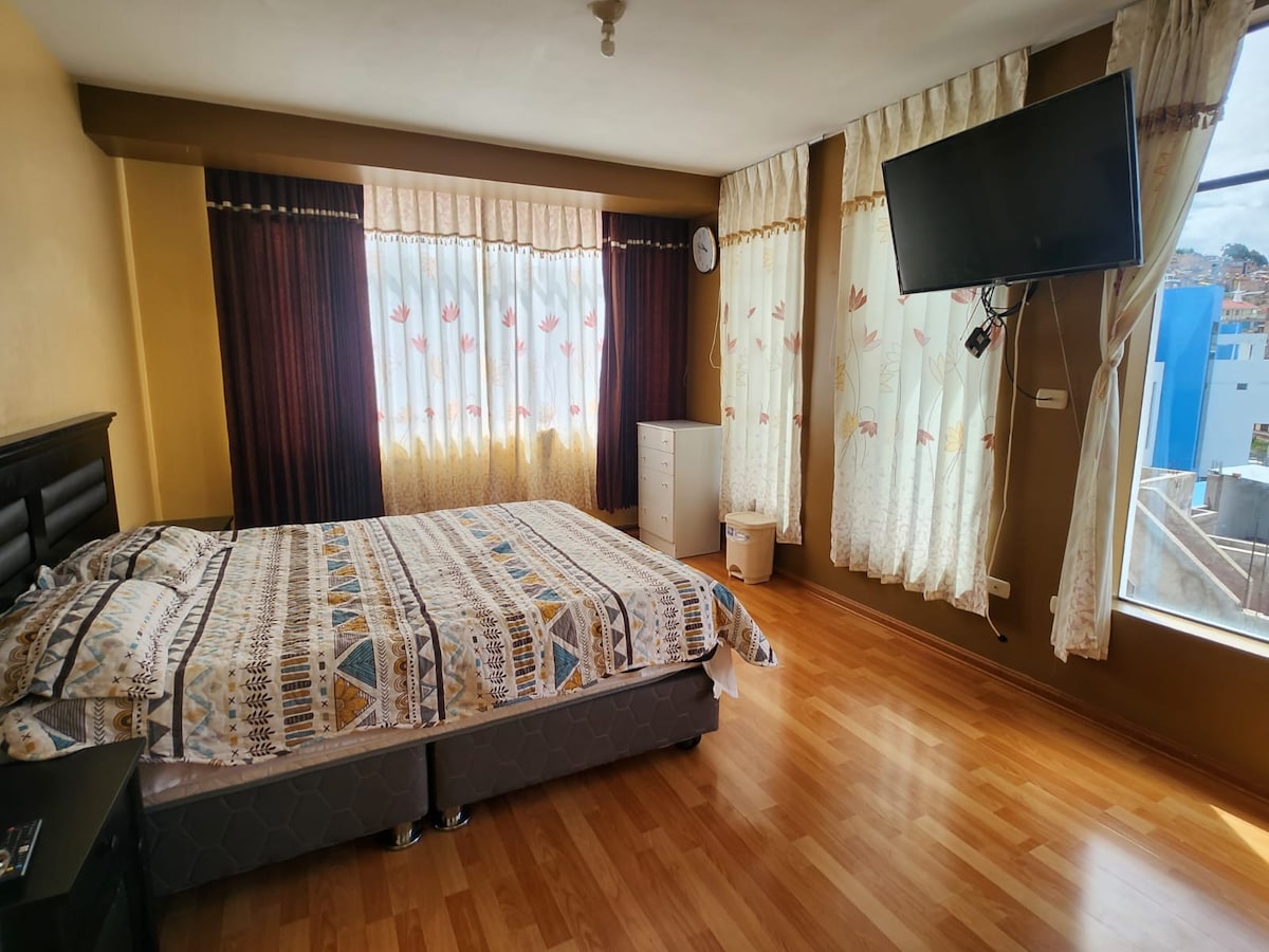 Priveliștea te va impresiona și se va bucura de un mediu privat și luminos! ❇️ Living cu TV inteligent ❇️ Stație de ceai cu ceainic, termos, cuptor cu microunde și veselă. ❇️ 1 pat dublu. Duș ❇️ separat și privat. Baie ❇️ independentă și privată. Garaj ❇️ privat (cu plată suplimentară) Zona este sigură și puteți vizita o piață tradițională, veniți și vă puteți cufunda în cultura Puno!