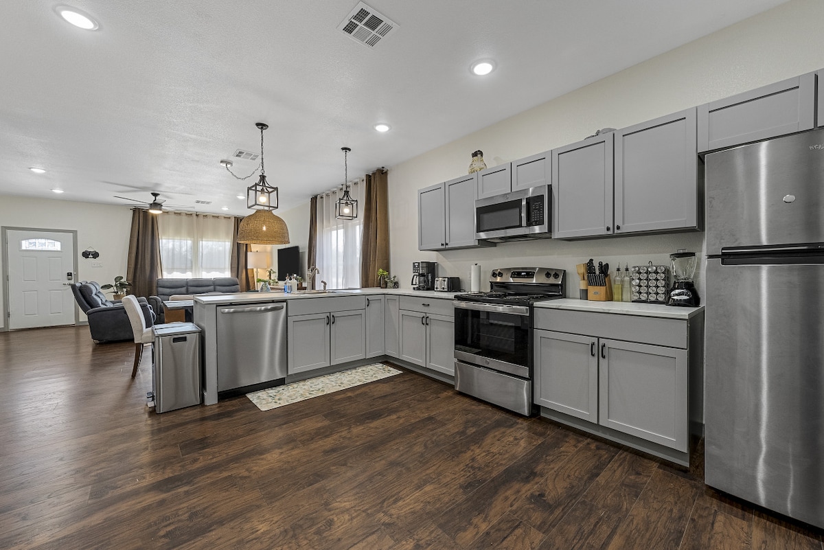 Această casă nouă de construcții are 4 dormitoare și 2,5 băi pentru a găzdui maximum 10 persoane. Este o casă cu 2 etaje. La doar 5 minute de centrul orașului Waco și la câțiva pași de grădina zoologică Cameron Park. Vino să te relaxezi și să ai o ședere cu saună, cadă cu hidromasaj, vatră și sală de jocuri. O bucătărie complet aprovizionată și un grătar cu gaz în aer liber pentru a găti și a te bucura de vremea noastră din Texas. Avem câte ceva pentru toată lumea aici, la 5th St Retreat!