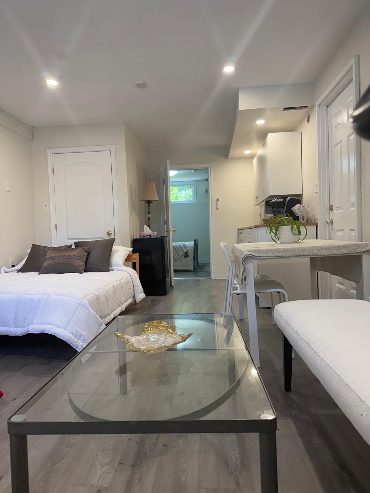 Bine ai venit la Edgewater. Apartamentul nostru cu grădină este o suită complet privată,separată. Oaspeții au propria intrare privată. Cu vedere la grădini și lac, te poți bucura de răsărituri și lacuri spectaculoase. Ascultă chemarea loonilor în timp ce se localizează unul pe lac. Apartamentul are o cameră de zi confortabilă, cu masă și chicinetă utilată ( prăjitor de pâine, cuptor cu microunde, presă de cafea, ceainic) (nu există facilități de gătit). În afara camerei de zi se află un dormitor confortabil și o baie privată.