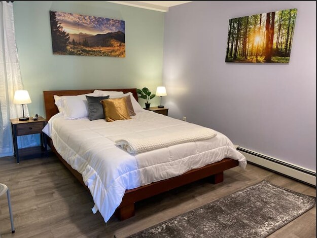 Tucked away on Lake Lamoille in Morristown, this beautiful brand new apartment is just minutes from town and yet offers tranquility and spectacular views. The lake is home to eagles, herons, geese, ospreys and fish! You will see kayakers out there fishing! Stowe Mt and Smuggler’s Notch are both nearby. Breweries, art galleries, restaurants are close by. You can walk or bike to the 93 mile Lamoille Valley Rail Trail from our home. Our shed is available for storing your bikes, kayaks or skis.