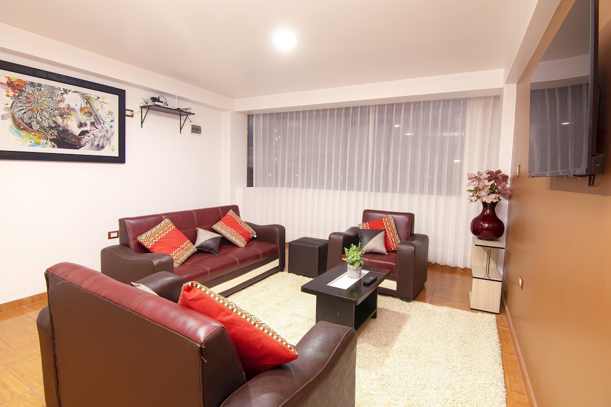 Apartament la etajul al doilea, la 5 străzi de aeroportul Inca Manco Capac din Juliaca, zonă liniștită, are o bucătărie mobilată cu sufragerie, living, două dormitoare cu paturi de 2 persoane și un garaj cu o plată suplimentară.