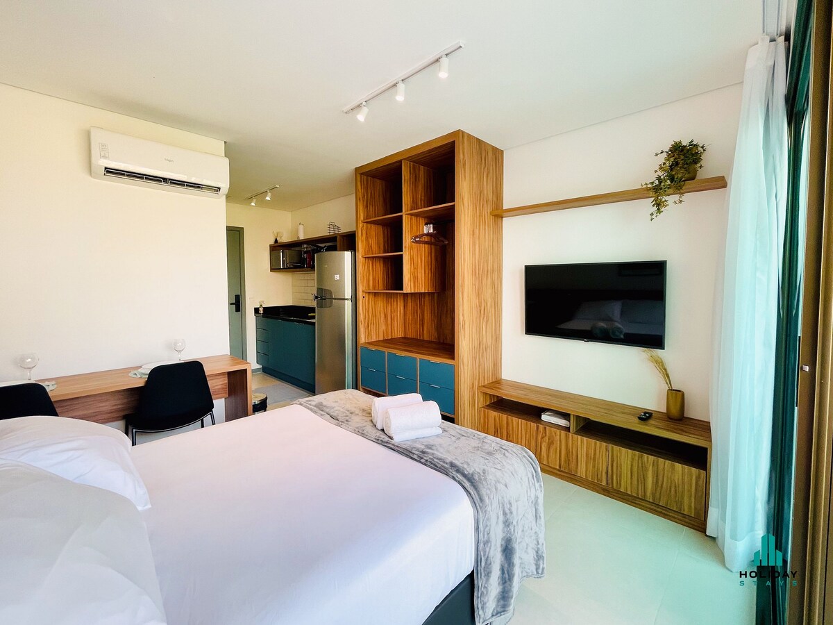 Bucură-te de o ședere sofisticată în acest studio nou și modern, situat într-una dintre cele mai înalte și codificate clădiri din oraș. La doar 500 de metri de Bulevardul Beira Mar, apartamentul are o terasă în grădină cu vedere panoramică la mare, sală de gimnastică și recepție non-stop. Apartamentul este compact, elegant și complet echipat, ideal pentru cupluri sau persoane care călătoresc singure și caută confort și posibilitatea de a lucra la distanță. Are Wi-Fi de mare viteză și un Smart TV de dimensiuni mari. Se află strategic în apropiere de