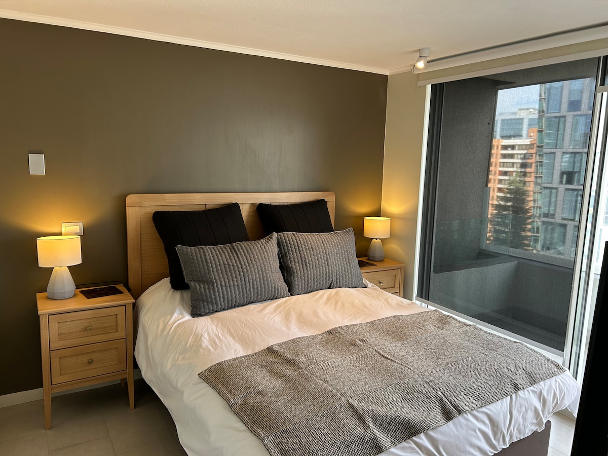 Bine ai venit@ la refugiul tău din Vitacura Te invităm să te bucuri de acest apartament confortabil și luminos, situat într-una dintre cele mai frumoase și mai sigure zone din Santiago. Aici te vei afla la câțiva pași de Parque Arauco, Open Kennedy, Parque Araucano și Clinica Germană. Apartamentul este conceput pentru a te face să te simți ca acasă: are o bucătărie integrată din lemn, complet utilată, astfel încât să poți găti orice dorești; un pat matrimonial foarte confortabil și o canapea extensibilă cu topper.