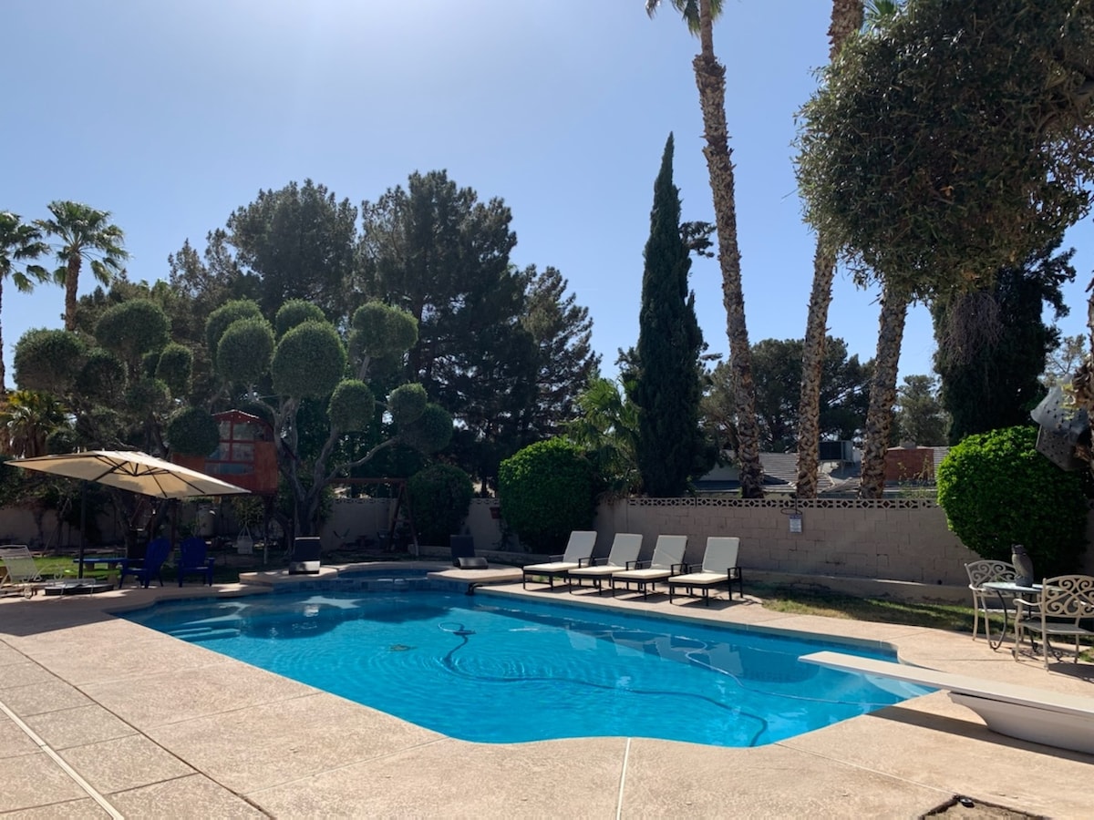 Bine ai venit în cea mai plăcută casă cu patru dormitoare, cu piscină privată și jacuzzi, în inima orașului Las Vegas! Această casă de vacanță relaxată este perfectă pentru familii, grupuri de prieteni sau persoane care călătoresc în interes de afaceri, cu Wi-Fi verificat, care caută o ședere confortabilă și elegantă în Sin City. Inclus pentru tine avem o masă de biliard de dimensiuni normale, masă de ping-pong, baschet de piscină, cornhole, golf pe scară. 50 USD/zi pentru a încălzi piscina. 25 $/ zi pentru a încălzi cada cu hidromasaj.