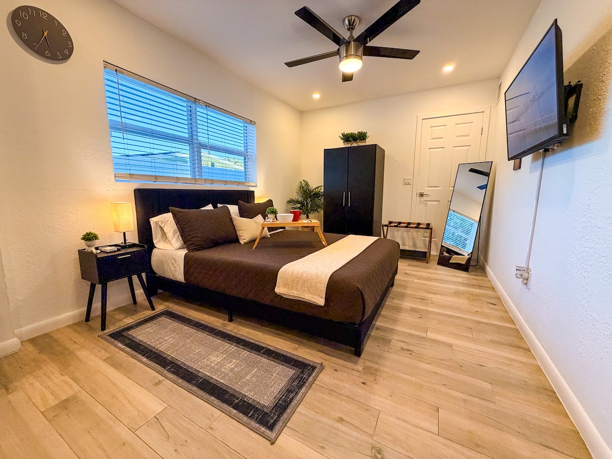Studioul privat de lux cu intrare privată (440 ft ² poate găzdui 3 persoane/2 mașini) este atașat la casa noastră și la 1,7 mile de plajă și adiacent la Ft Lauderdale. Parchează sub carportul acoperit. 1 pat matrimonial (și 1 saltea Queen Size-Blow Up), 1 baie, chicinetă, Wi-Fi cu fibră optică, TV cu ecran plat (140 de canale), ferestre de impact, dulap imens, ventilator/lumină, aer condiționat cu telecomandă, birou, scaun, masă pliabilă pentru a mânca w/ scaune, frigider mic, cuptor cu microunde, cuptor cu prăjitor de pâine, grătar Foreman, aragaz cu apă caldă, filtru de cafea.