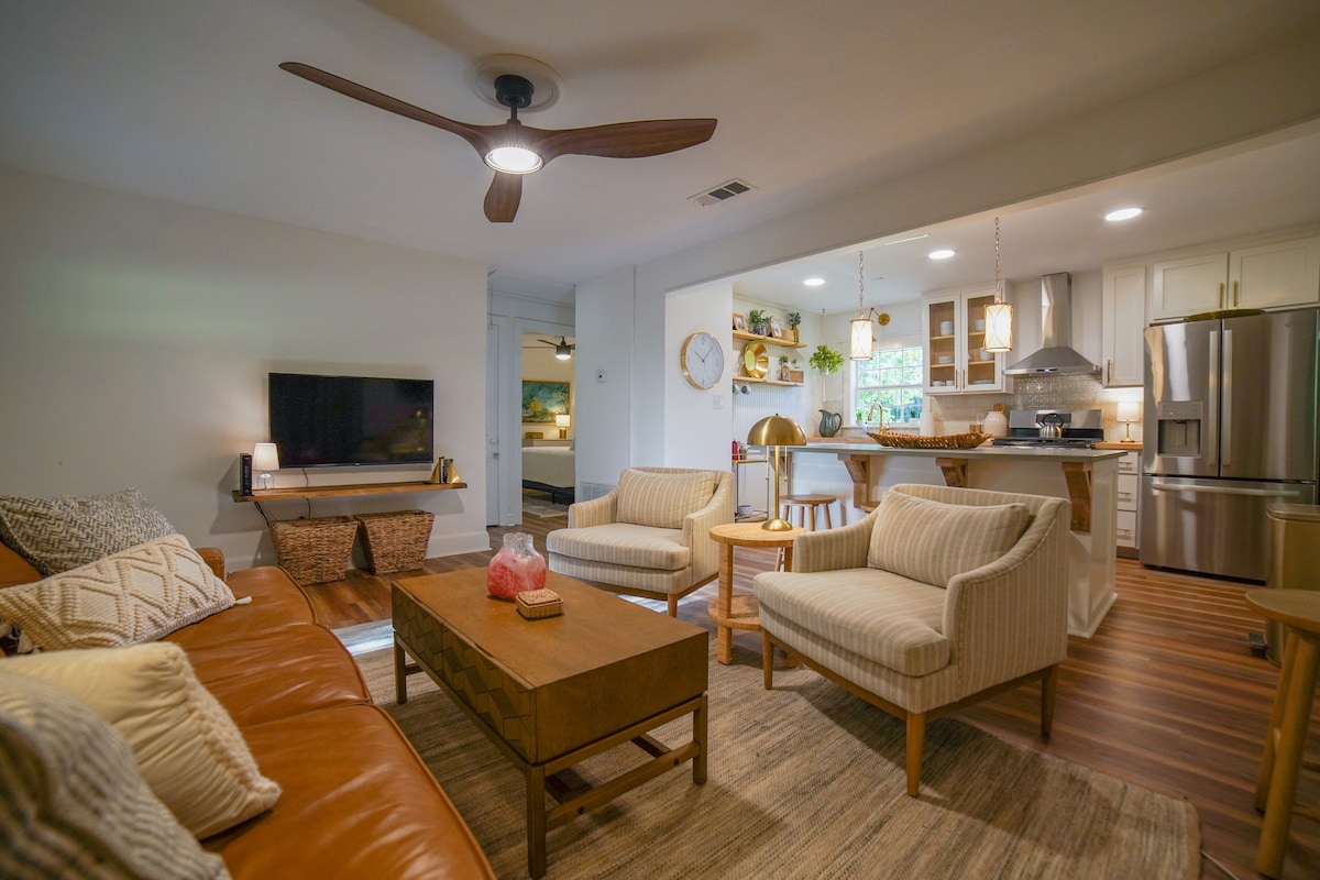 Looking for a hideaway just 3 blocks from town? Park your car and enjoy strolling the Aves. This cozy cottage features a screened in porch and back deck, firepit, hammock, and shared pool (shared with our bed and breakfast next door). It boasts a unique split design. The entire house is newly renovated and is available with 3 BR, 2 BA, 2 LRs, and a (fully equipped) farm-house kitchen.