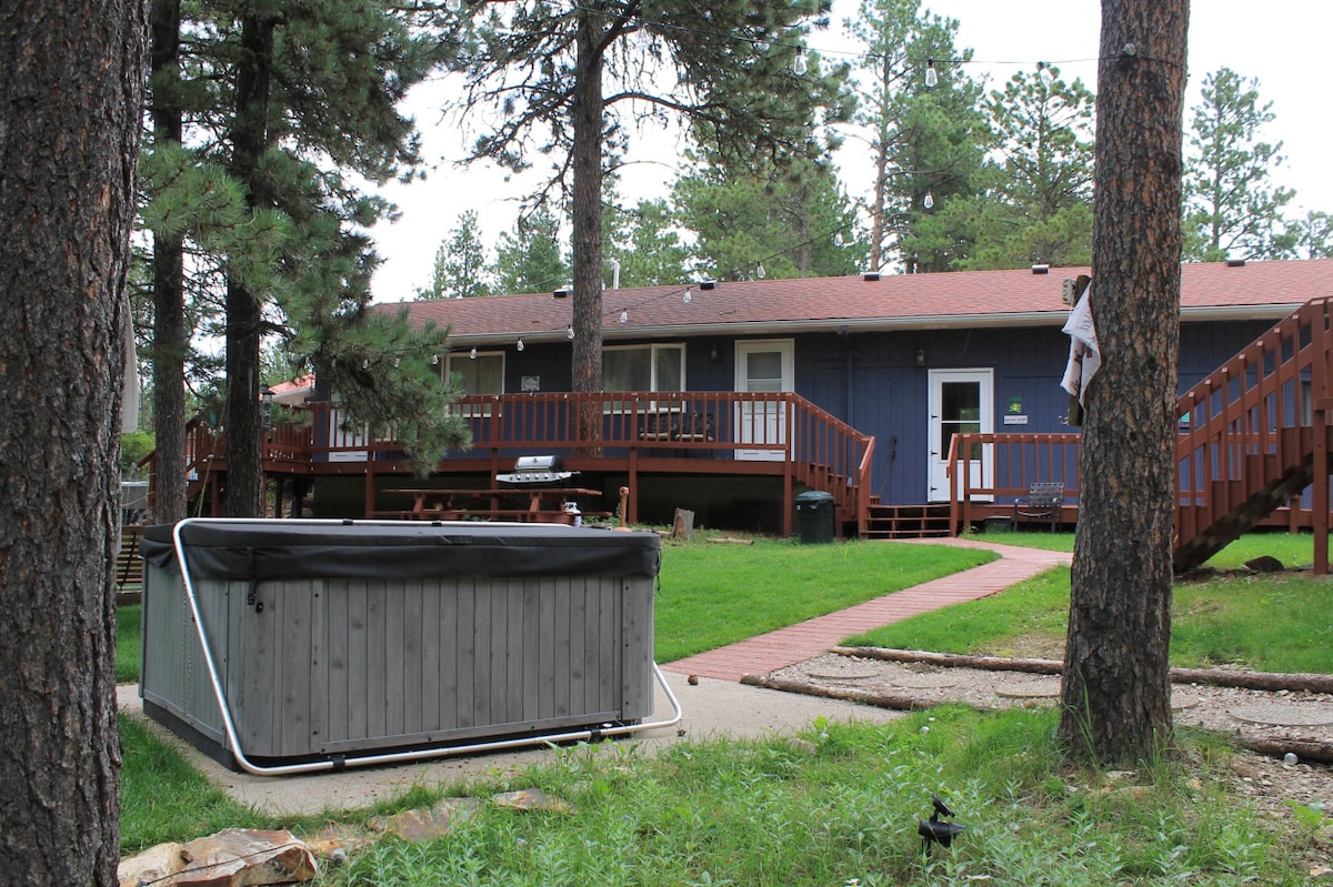Bine ai venit la Golden Nugget Retreat pe Terry Peak, unde se întâmplă aventuri nesfârșite în aer liber! Cabana oferă 3 paturi 2 băi, o bucătărie complet mobilată, spălătorie, televizoare inteligente, masă de Foosball, jocuri și un șemineu pe gaz. Ieși afară și relaxează-te în cada cu hidromasaj sau bucură-te de mobilierul din curtea pavată de pe terasa privată înconjurată de priveliștile pădurii de pini. Aventură pentru drumeții, ciclism, schi la Terry Peaks sau explorarea a sute de kilometri de trasee cu ATV/snowmobil. Sau verifică orașul istoric Deadwood