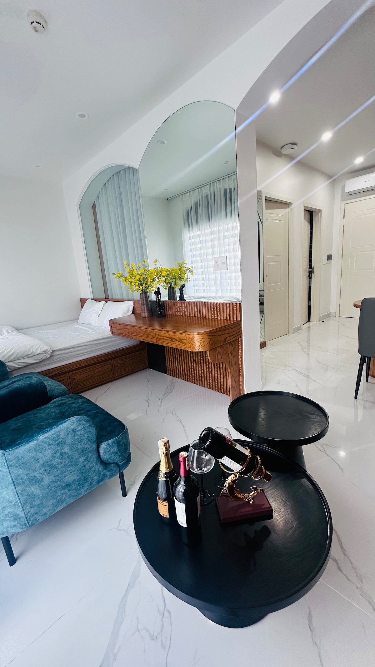 Căn hộ khép kín với phong cách wabisabi với đủ công năng từ điều hoà, tivi, máy giặt, lò vi sóng... đủ đáp ứng nhu cầu sinh hoạt cho khách hàng lưu trú ngắn ngày và dài ngày. Phòng ngủ với cửa khoá riêng, tuyệt đối riêng tư và yên tĩnh. Đệm cao su non dày 20cm, êm ái và thoải mái. Phòng khách với sofa bọc nhung, mịn màng, tivi màn hình phẳng cỡ lớn đã kết nối các tài khoản netflix... Phòng bếp được trang bị đầy đủ: Bàn ăn, bếp từ đôi, lò vi sóng, máy rửa bát, nồi lẩu, bát đũa, xoong nồi...