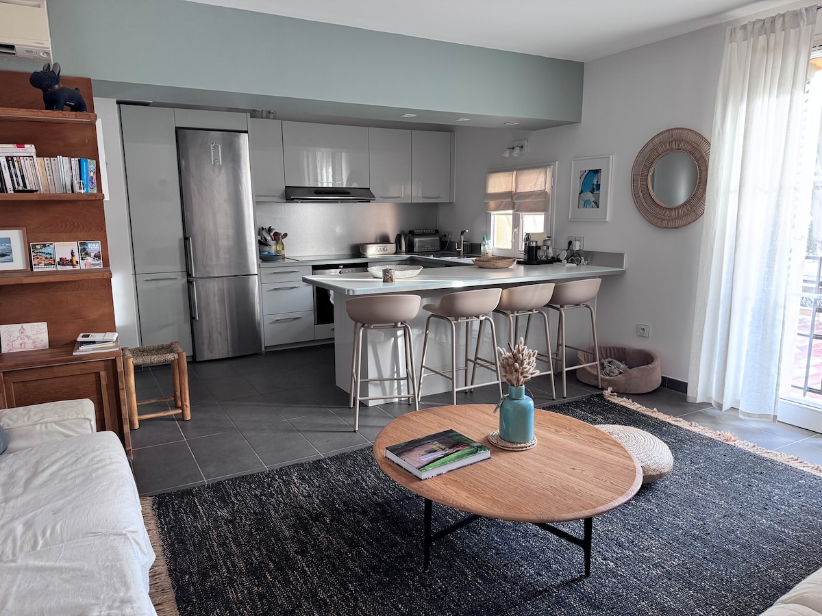 Oferim un apartament complet renovat în Porquerolles, cu aer condiționat/încălzire. 3 minute de mers pe jos până în centrul satului. Într-o zonă liniștită, la primul etaj al unei clădiri mici. Se compune dintr-un prim dormitor cu pat matrimonial (160x200). Și un al doilea dormitor cu 2 paturi suprapuse (90x200). Ideal pentru o familie. O baie cu duș mare și mașină de spălat rufe. Un living minunat cu bucătărie deschisă utilată. Și un balcon unde este frumos să iei masa.