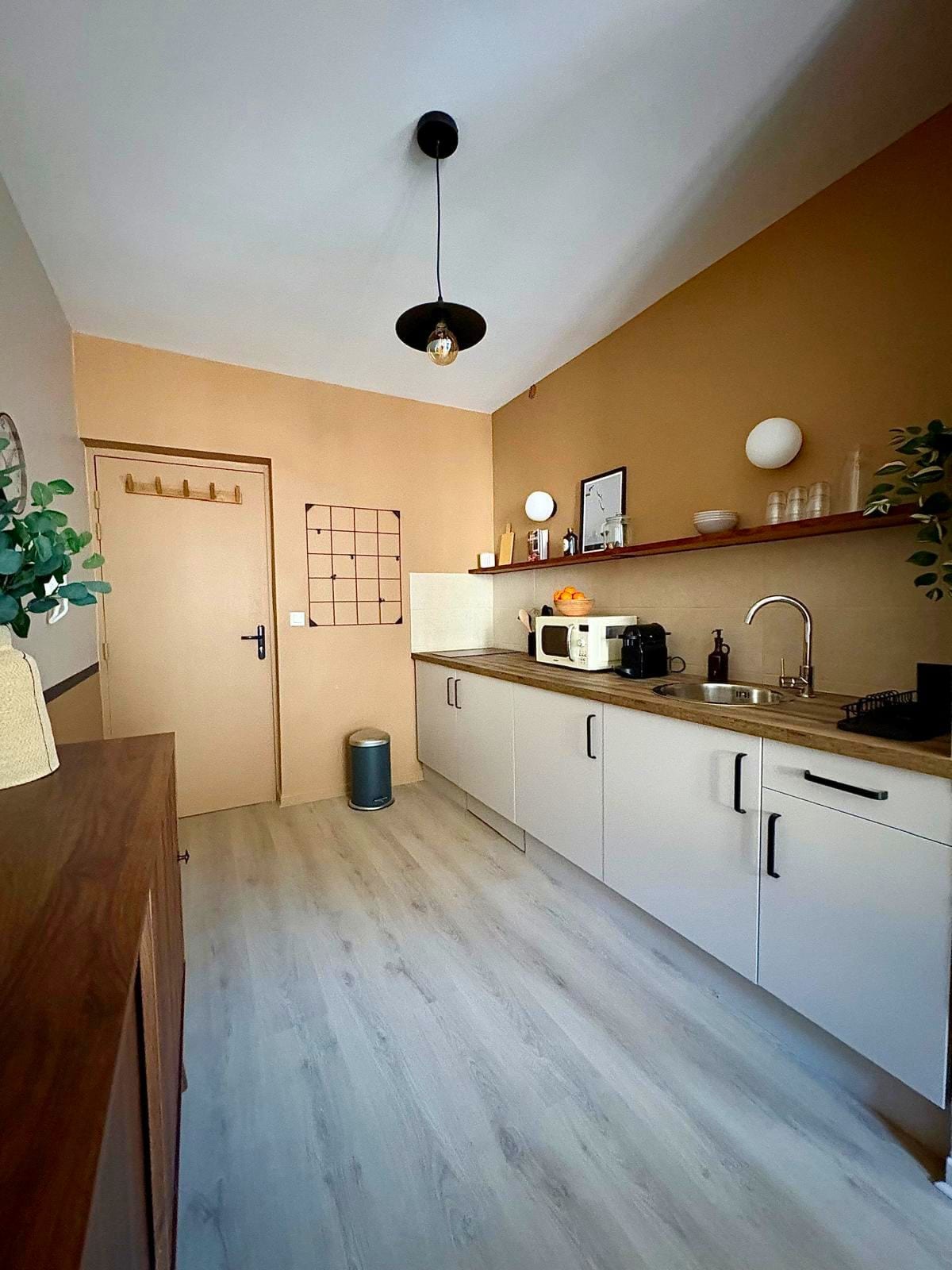Uită de obișnuit! Bine ai venit în studioul nostru, complet renovat și decorat de un designer de interior, inspirat de aparthotelurile de lux. Fiecare detaliu este nou și conceput pentru bunăstarea ta: lenjerie de pat, bucătărie utilată, TV, Wi-Fi, atmosferă de designer. Situat în Le Teil, aproape de magazinele din centrul orașului. Spații libere la poalele clădirii + mai multe parcări în apropiere. Rezervă acest cocon și bucură-te de o ședere la cheie, fără stres.