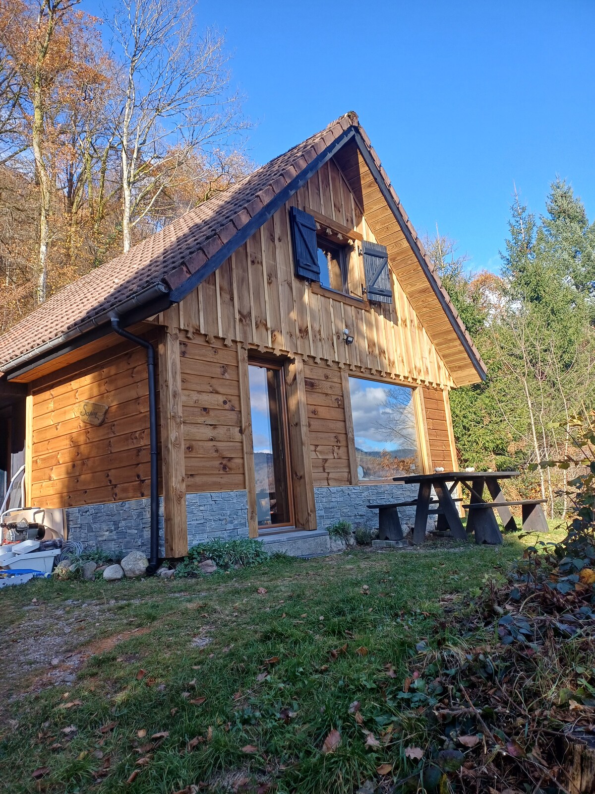 Cabana noastră de 45 m2 se află în înălțimile satului Le Ménil, la o altitudine de 750 m, într-un cadru verde, departe de toată agitația , vă veți bucura de un mediu de viață ideal pentru relaxare și drumeții. O terasă amenajată corespunzător de 16m2 și multe spații de jur împrejur , grătar, masă de ping-pong, Tobogan, teren petanque, grădină de flori, iazuri mici, rațe, găini etc. te va face fericit pe tine și pe copiii tăi. Gabriel și Nathalie
