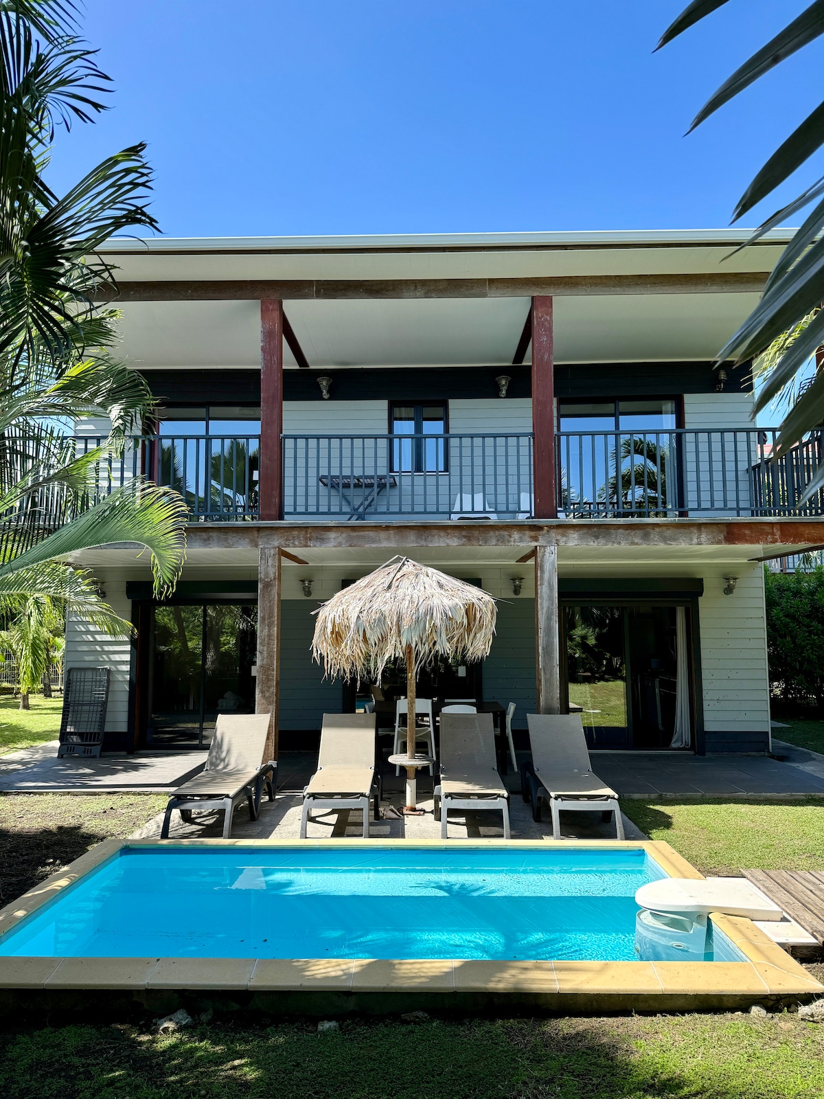 La Maison de Bel Air este o vilă modernă frumoasă și mare, clasificată la 5*, în Vauclin, într-o zonă liniștită. Poate găzdui până la 12 persoane în 5 camere cu aer condiționat și 5 băi. Nu mai ezita: - ia masa pe terasa din jurul mesei mari - mobilierul de grădină de lângă piscină este perfect pentru un aperitiv - întinde-te pe șezlonguri - bucură-te de grădina mare cu teren de volei și pétanque - relaxează-te în cada cu hidromasaj sau în saună