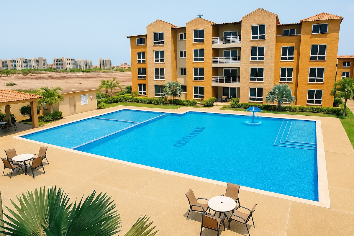 Apartament confortabil cu vedere relaxantă la canal, ideal pentru deconectare. Situat într-o zonă centrală cu produse lactate, la doar 5 minute de plajă, restaurante și supermarketuri. Bucură-te de trasee pietonale, zone verzi, 3 piscine, grătar și doc unde poți îmbarca barca. Terasă privată cu grătar, bucătărie utilată, supraveghere non-stop, acceptă animale de companie. Tot ce îți trebuie pentru a trăi sau a-ți petrece vacanța în confort total. Avem serviciul Lancha disponibil.