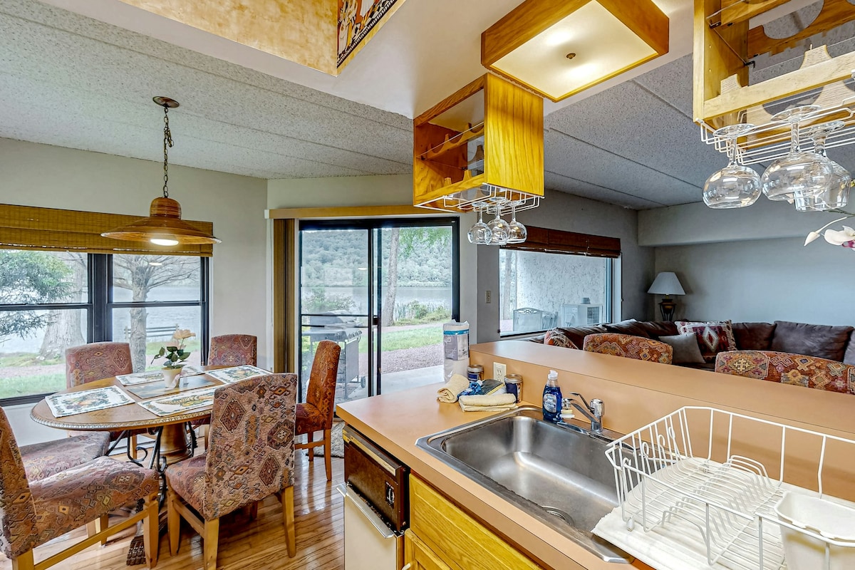 Accesibilă, potrivită pentru câini, pe malul apei, cu priveliști uluitoare, la numai 50 de metri de lac. Intrare/duș fără trepte, lift. Recent renovat și mobilat elegant cu 4 dormitoare, 3 băi complete, cadă cu hidromasaj, saună, bucătărie gourmet, masă personalizată de 12 persoane, cafenea, șemineu, sală de jocuri cu biliard/foosball/arcade, multe jocuri în aer liber, 3 punți în aer liber, grătar cu ouă mari verzi, groapă de foc, masă de foc, hamace, multe tipuri de bărci, stâlpi de pescuit, birou de lucru, WiFi de mare viteză, 5 televizoare inteligente, EV, încărcător.