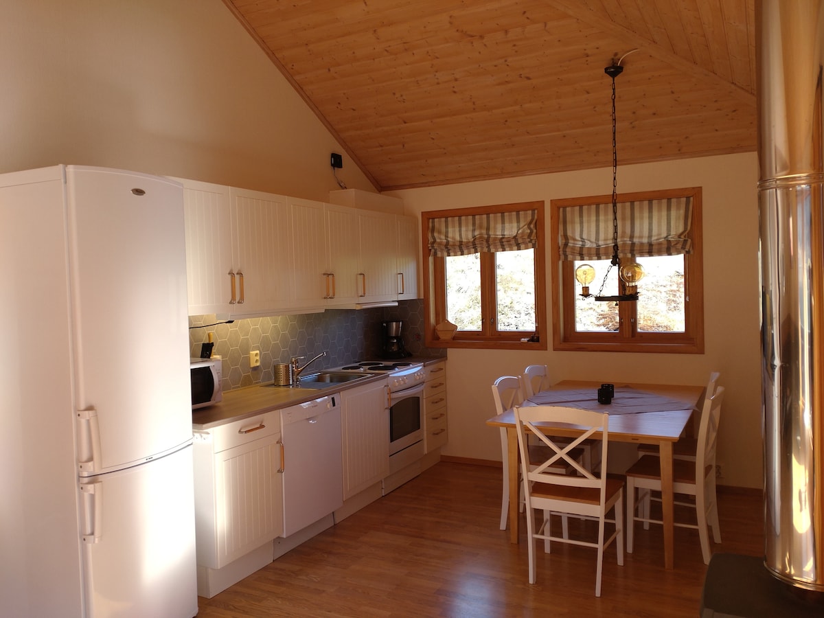 Cabană montană confortabilă la 350 m deasupra mării! Aici există împrejurimi foarte liniștite, cu posibilitatea de drumeții montane chiar în spatele cabanei sau un loc unde te relaxezi complet în câteva zile. Vedere uimitoare către fiorduri și munți. 2 dormitoare și posibilitatea de a plia canapeaua din living cu un pat cu saltea extensibilă pentru un al treilea pat Sunt aproximativ 350 de metri de mers pe jos până la cabană prin pădure și teren, se recomandă încălțăminte bună