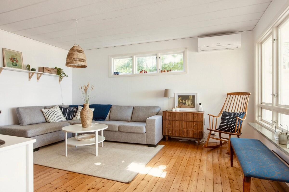 Bucură-te de liniștea din Dansjö! Bun venit în această căsuță frumoasă, confortabilă și confortabilă (25mp) . Duș cu gresie, încălzire prin pardoseală, bucătărie utilată, terasă mare, grădină și grătar. 1 cameră cu 140 de paturi + 1 cameră cu zonă de luat masa și fotoliu de pat. Wi-Fi excelent. Aici poți să mergi cu zbaturile, să pescuiești, să faci drumeții și să te plimbi cu bicicleta într-un peisaj istoric frumos. Teren de golf cu restaurant și pârtie de schi/coborâre la 1 km. Club de zboruri cu vele la 3 km. Canoe, două caiace și biciclete incluse. Cuplul de gazde este uneori în cabana de alături, dar promite intimitate.
