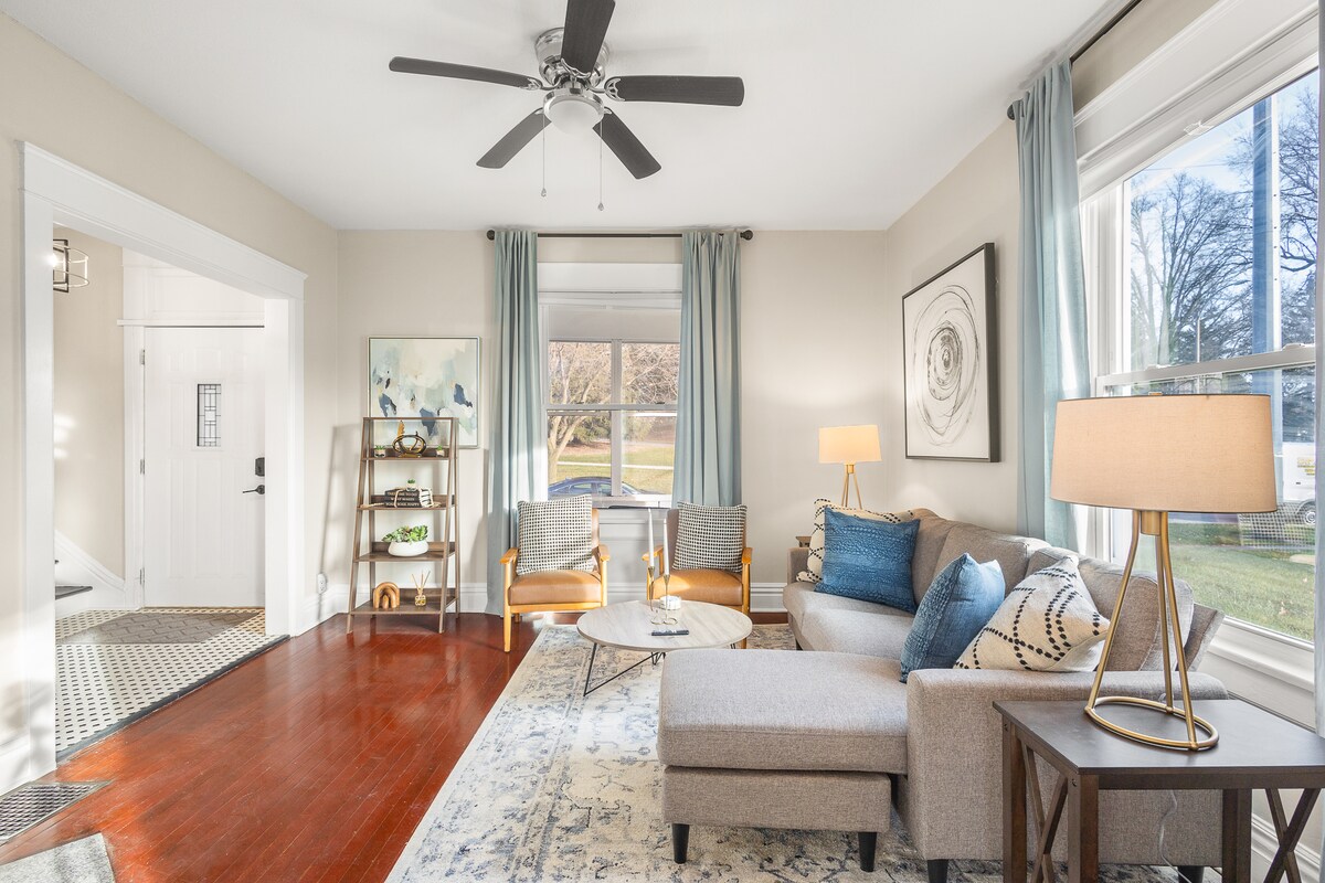 BUNGALOW CURAT COTTAGE-Y ÎN INIMA FORT WAYNE - amestec perfect de farmec istoric și decor de la mijlocul secolului. Toată lumea este binevenită aici! -1 milă de centrul orașului, PFW și Indiana Tech. - Aproape de cafenele, restaurante, biblioteci și (să fim sinceri) Target -Smart TV și WI-FI RAPID - Cearșafuri și lenjerie de pat ieftine - Cameră de zi confortabilă, luminoasă pentru lectură și muncă - Mașină de spălat/uscător - Bucătărie încuiată - Parcare stradală - -1 stradă de grădina istorică de trandafiri de pe malul lacului.