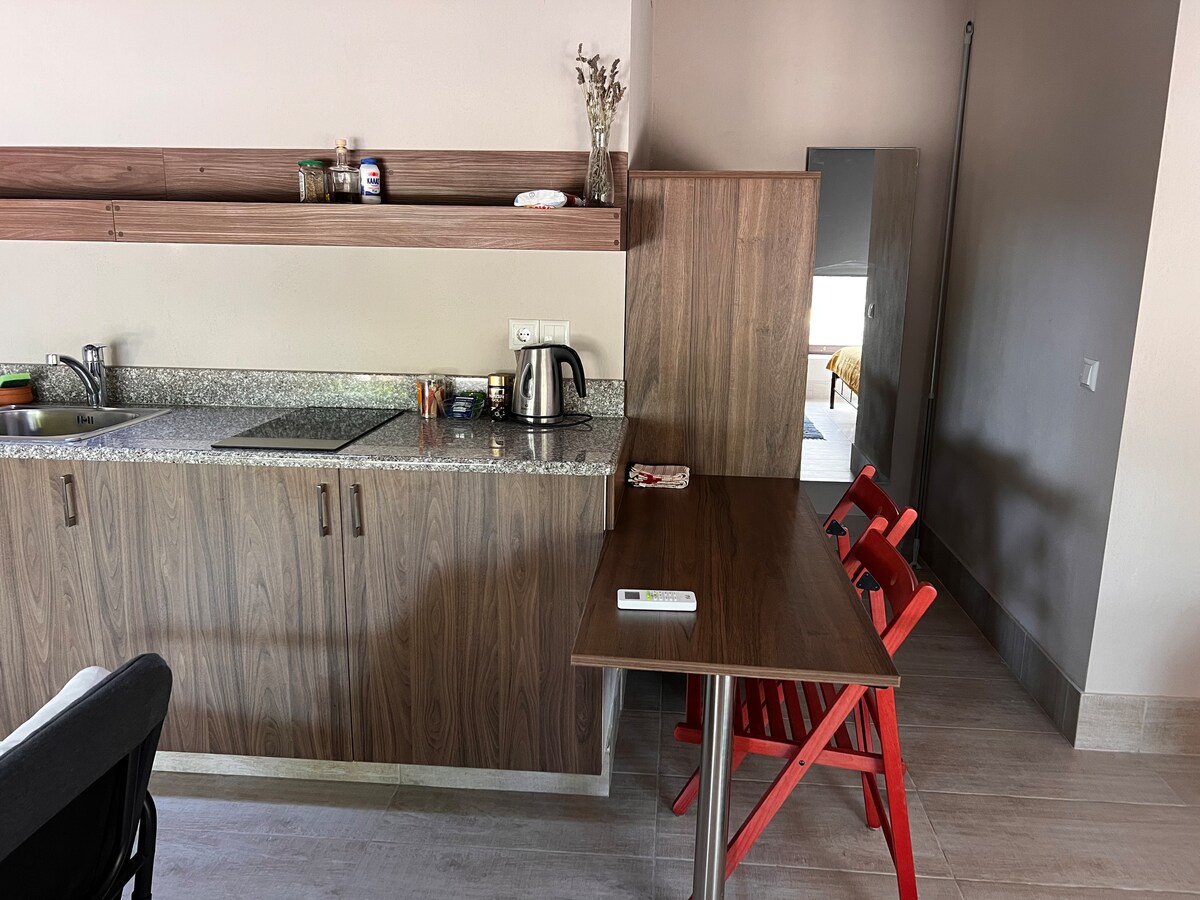 This is a 12sq.m. independent studio and It has a double build in bed. n the studio there is also a fully equipped kitchen with a coffee maker.There is a small balcony where you may enjoy your coffee watching the ocean. The studio is located in a quiet area at the beachfront of Eressos and it is around 10metres from the water .Also its 50metres away from the first taverna and shops.