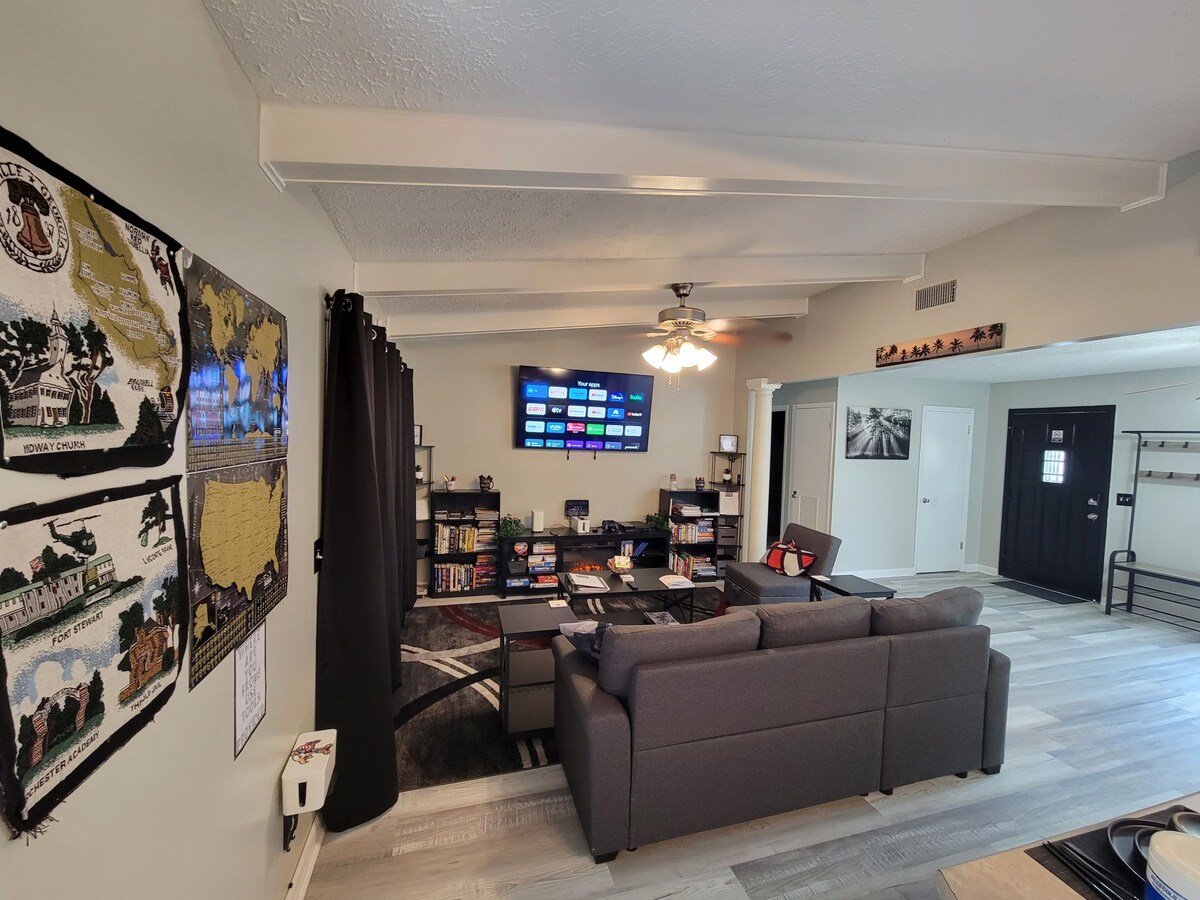 Bine ai venit la elegantul nostru Boho Chic Retreat Savannah! Această locuință de designer cu 3 dormitoare și 2 băi oferă confort, comoditate și o notă de ospitalitate sudică. Indiferent dacă dorești să lucrezi de la distanță, să explorezi orașul sau pur și simplu să te relaxezi, acest refugiu are câte ceva pentru toată lumea. Curtea închisă asigură o experiență sigură și plăcută pentru bebelușii tăi cu blană. Spațiul de divertisment din garaj are tenis de masă, proiector cu ecran de 100"și multe altele. Pasionații de gătit vor iubi bucătăria noastră complet utilată.