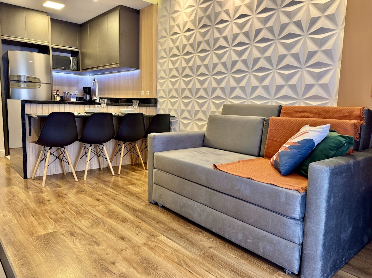 Apartamento 1 quarto com acabamento premium no Batel. Quarto com cama de casal, parede 3D e iluminação LED como destaque visual. Sala com sofá cama, cozinha equipada e sacada. Ar condicionado. Para até 4 hóspedes, ideal para casais ou viajantes a trabalho. O Sky é condomínio clube com duas piscinas (coberta aquecida e ao ar livre), sauna, jacuzzi, academia, sala de jogos, playground, brinquedoteca e mercadinho. Garagem inclusa na diária.