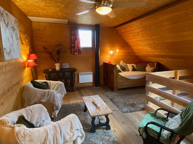 Răsfață-te cu o pauză fermecată în cabana noastră confortabilă. Cabana noastră de 20 m2 este complet echipată cu o zonă de relaxare, bucătărie și pat la mezanin. În spiritul locului, baia este amenajată într-o mică cabană independentă, la o scurtă plimbare de cabana principală. * Toaletă uscată ecologică pentru o ședere mai ecologică *Piscina este deschisă între aprilie și septembrie.