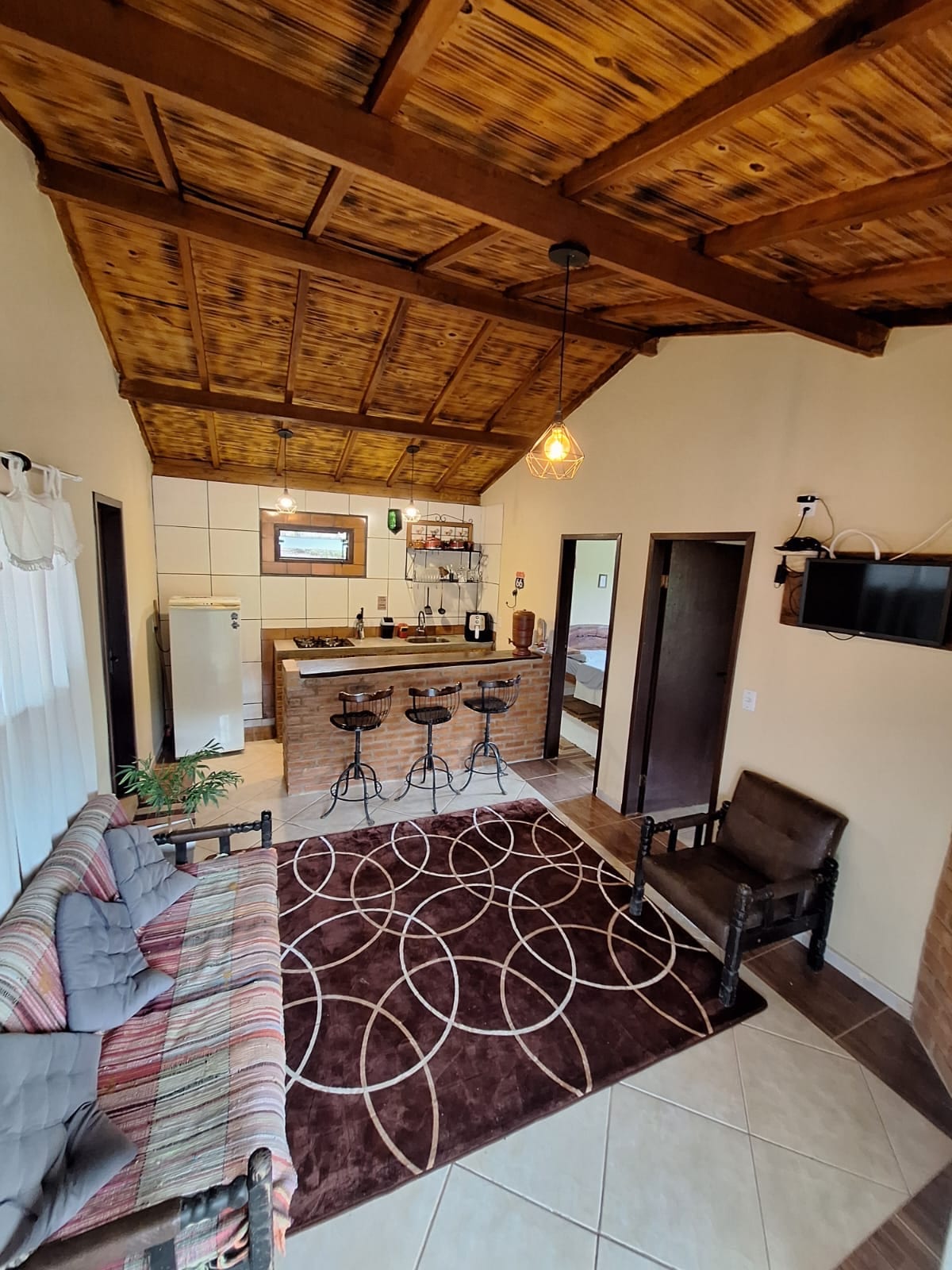 Possuímos sala com lareira, sofás e escada de acesso ao segundo andar. Cozinha americana totalmente integrada, em conceito aberto, com balcão e seis banquetas, ideal para um momento de relaxamento e socialização junta a lareira. Quatro quartos, dois banheiros e um mezanino/sala de tv, localizado no segundo andar, com varanda e sacada para apreciação da vista. Possui ainda sofá cama de casal, que permite sua utilização como cama. Área externa com varanda de três lados e amplo deck ao ar livre.
