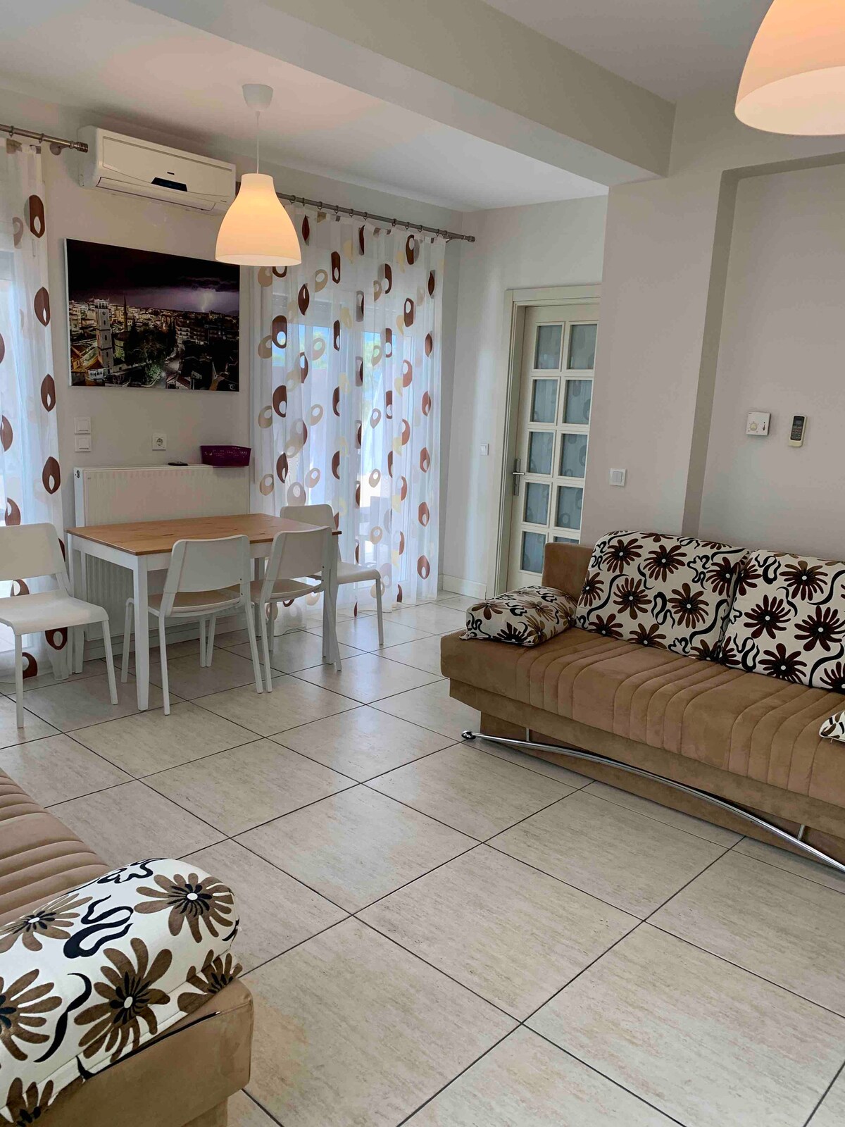 Apartament de 70 mp, cu două dormitoare în centrul orașului, la 3 minute de strada pietonală Venizelou, la 5 minute de piața principală. Situat într-o locație excelentă, la 10 minute de mall-ul Kosmopolis și la 5 minute de stația studențească urbană. Spațios, deci este ideal pentru familii și grupuri. Apartamentul are o bucătărie utilată, filtru de cafea, fierbător de apă, fierbător de apă, mașină de spălat rufe, uscător de haine, fier de călcat ,uscător de păr. Check-in și check-out non-stop pot fi prelungite gratuit.