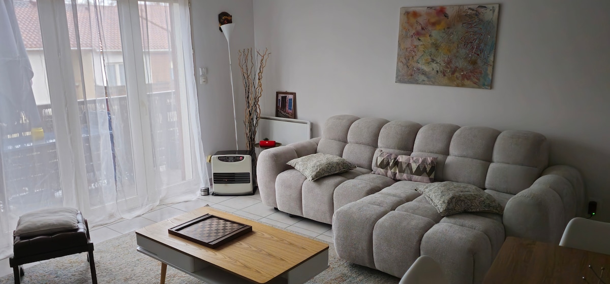 Apartament liniștit, spațios și luminos cu 2 dormitoare 60m2 + 5m2 masă de terasă și scaune pe balconul umbrelei Bucătărie utilată Canapea convertibilă Loc de parcare complet privat și umbrit Cadă/duș în baie Aproape de plaje. În inima satului 100 m de piață lenjerie de pat/prosoape de duș furnizate, dar paturile nu sunt făcute Transfer gratuit pe plajă la 100 m distanță(vară) Trasee de ciclism la câteva minute distanță Animalele DE companie sunt binevenite LA CERERE Fumatul este permis numai pe balcon