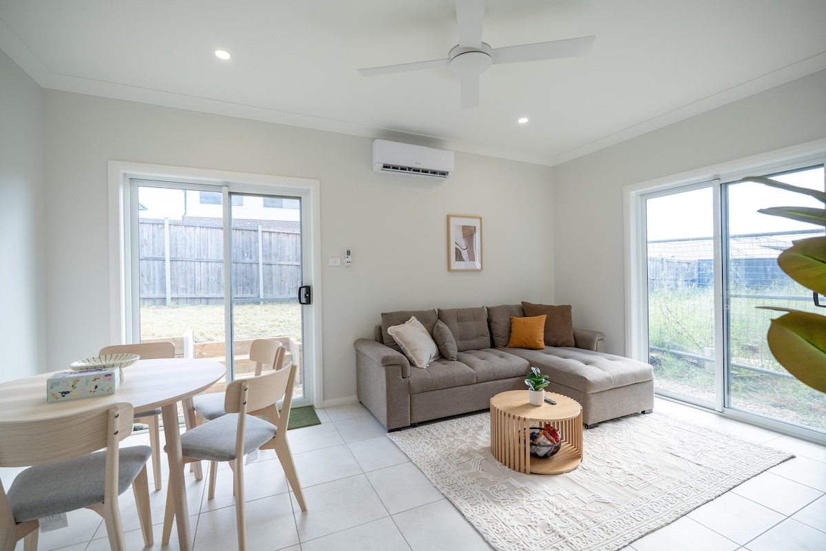 • 6 mins to new Western Sydney Airport, 20 mins to Penrith, close to shops & restaurants • Bedroom: A/C, 2 double beds, built-in wardrobe, smart TV, electric openable skylight with double-glazed glass, acoustic slats padding with LED Strip light, LED ceiling fans with remote control • Living: A/C, modern newly renovated full kitchen, 65" smart TV, ultra-fast Wi-Fi • Bathroom: double sinks, LED mirror, washer & dryer • Shared backyard with LED-lit gazebo & BBQ, outdoor furniture chairs, tables