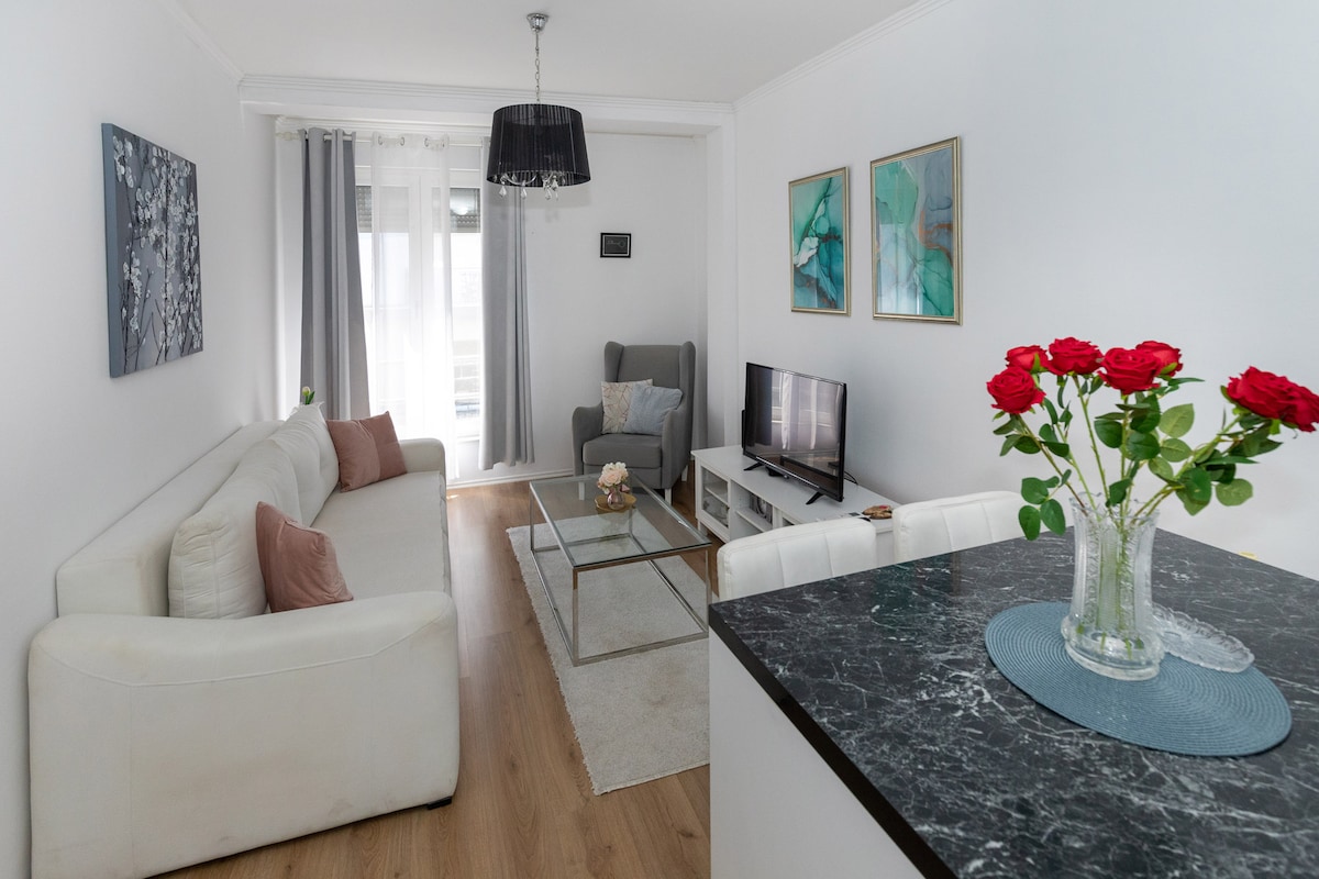 Nanda Apartment is located in the city center, right next to Mepas Mall (the biggest shopping center in Mostar). Two main bus stations are 1km away. In the same building, you can find fancy bars, restaurants, supermarkets, etc. For those with children, there is a beautiful city park about 10 minutes walking distance. Our spacious apartment includes a bedroom, a seating area with a sofa, a fully equipped kitchen, and a bathroom with a shower. Easy access to the elevator, no stairs.