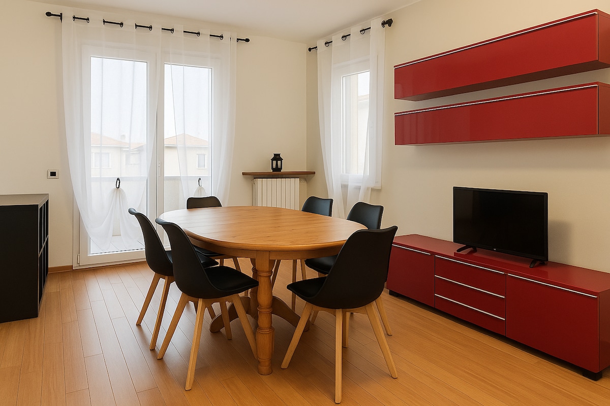 Elegante appartamento da circa 65 mq al piano terra in palazzina da 6 unità ( tranquilla ) vicinissimo all'Aeroporto, ad Orio center e alla Fiera di Bergamo, tutti raggiungibili a piedi, l'appartamento ha una camera da letto con letto matrimoniale, ampio soggiorno con divano letto a due posti , Tv, cucina attrezzata, bagno, lavanderia con lavatrice, totalmente climatizzato - TASSE DI SOGGIORNO INCLUSE - PROMOZIONE FAMIGLIE ogni due bambini uno non paga - COLAZIONE OFFERTA DA NOI