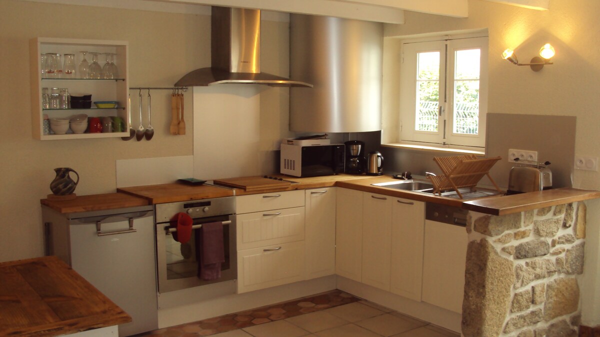 Casă de pescari renovată într-un cul-de-sac cu terasă închisă, 2 biciclete disponibile în depozitul exterior, în inima satului Locmiquélic. Magazinele, portul de agrement sunt la 200 m distanță, poți ajunge în centrul orașului Lorient cu autobuzul cu barca în 6 minute și te poți bucura de plajele din Port Louis în 5 minute cu bicicleta. Casa este formată dintr-un living la parter cu o bucătărie utilată deschisă spre living, o baie cu duș cu toaletă; 1 dormitor la etaj. Fumatul este interzis, animalele de companie nu sunt permise.
