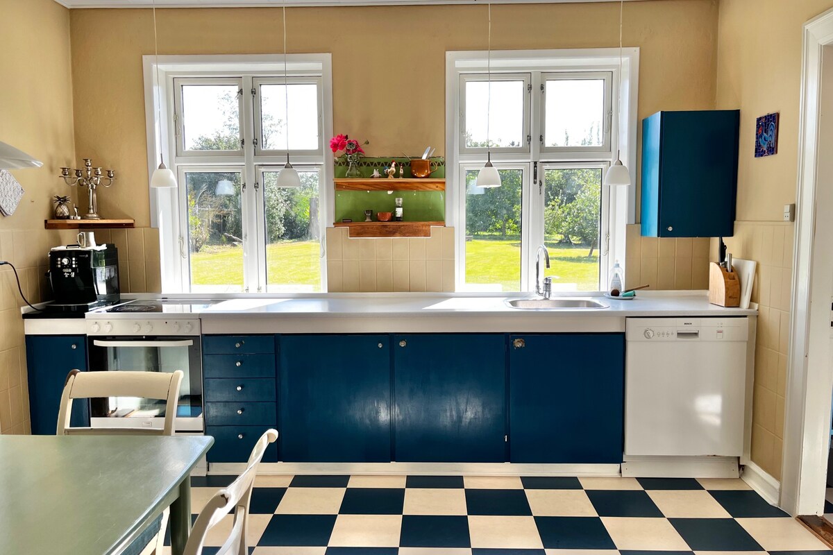 Visit one of Denmark's most popular islands and stay in a luxurious half-timbering house with an impressive fireplace. The house is hidden in one of the old gardens in the center of Ærøskøbing, 2 minutes walk from the ferry. Surrounded by your own quiet garden ¨the forest¨ where the big old gardens meet, with two private terrasses. The spacious 40 sqm house is newly renovated with modern comfort. The house is decorated with handpicked effects from our vintageshop ''TingGyden13''
