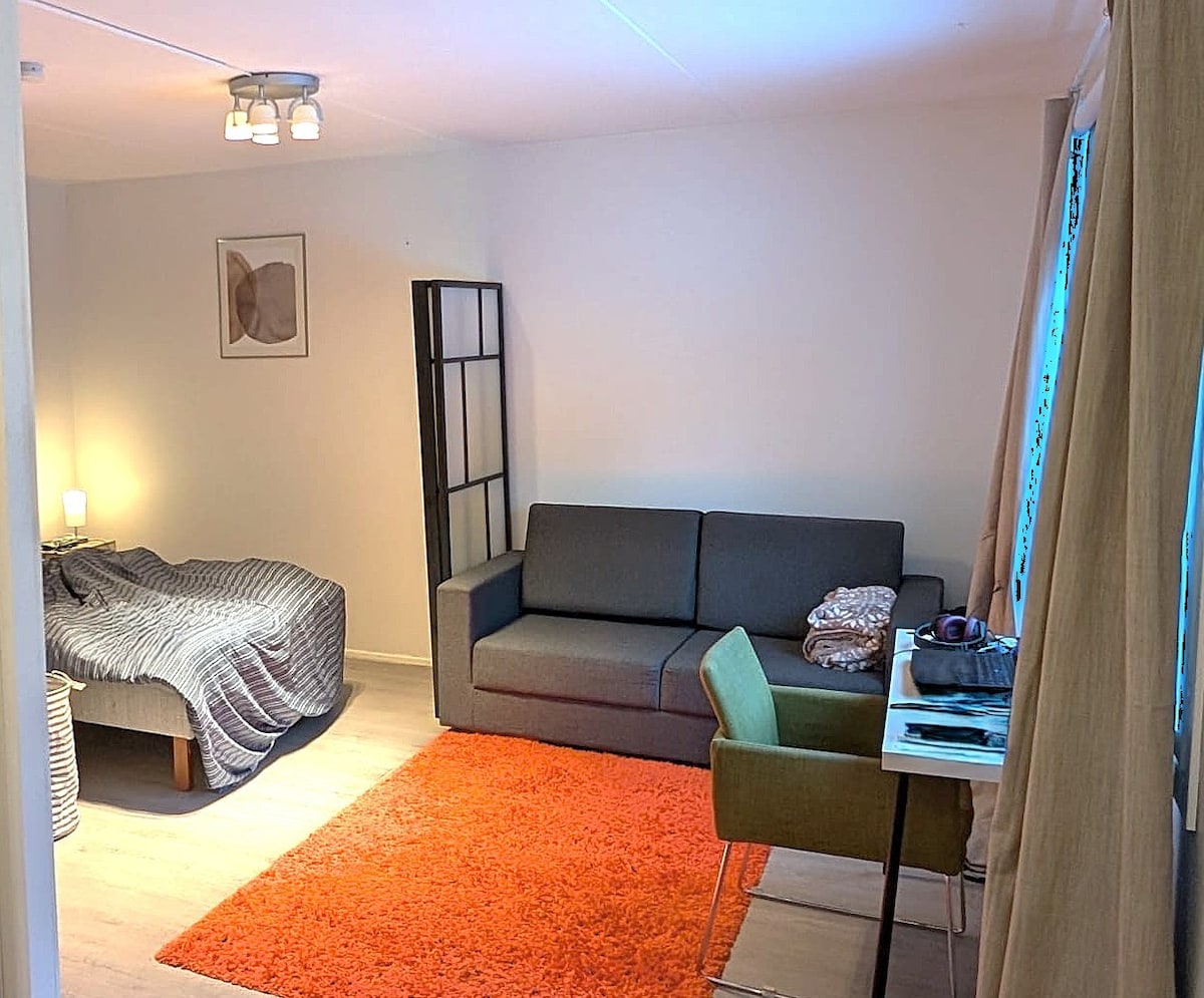 Studio frumos și confortabil în Sarvvik, lângă lacul Finnträsk, complet echipat cu un balcon. Apartamentul are un pat dublu de 140 cm lățime și poți obține o saltea suplimentară sau un pat de campanie pe podea. Apartamentul are un loc de parcare gratuit dedicat pentru utilizatorii de mașini lângă intrare. Echipamentul include, de asemenea, Wi-Fi rapid, un televizor cu ecran plat de 50"și un sistem audio wireless. Din partea din față a casei, poți lua autobuzul până la stația de metrou Matinkylä/Iso Omena în 13 minute.