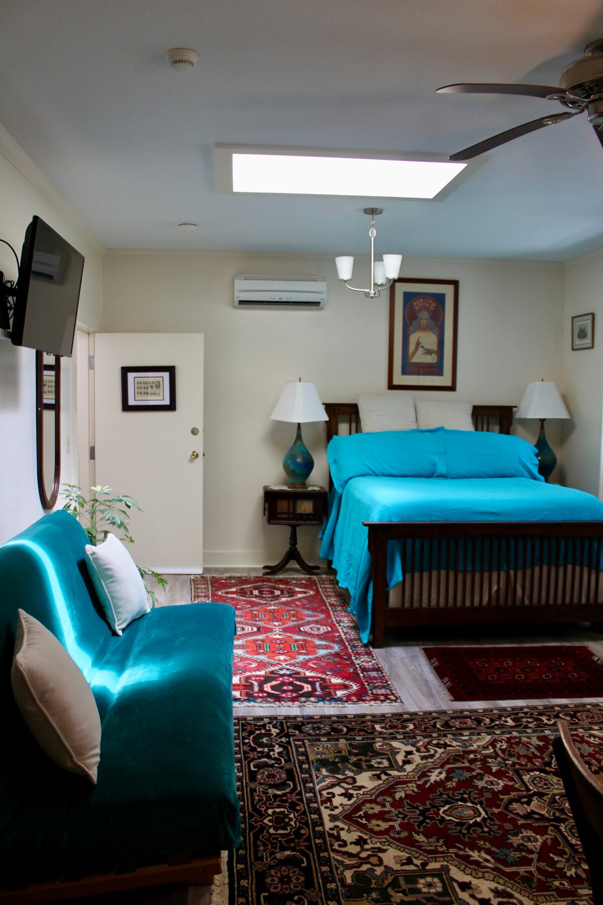 Acest apartament de oaspeți de la etajul al doilea din locuința mea are o intrare privată printr-un set de scări în aer liber (pentru detalii, consultă secțiunea Accesul oaspeților), bucătărie completă și baie (cadă, dar fără duș). Planul deschis al etajului include o cameră din față cu pat dublu și o cameră TV mai mică cu canapea futon pe care o transform într-un pat dublu, după cum este necesar. Inițial, studioul meu de artă, îl ofer acum pentru șederi de scurtă durată. Politica privind COVID-19. Permit 24 de ore între rezervări (fără cifre de afaceri în aceeași zi). Solicit ca oaspeții mei să fie complet vaccinați.