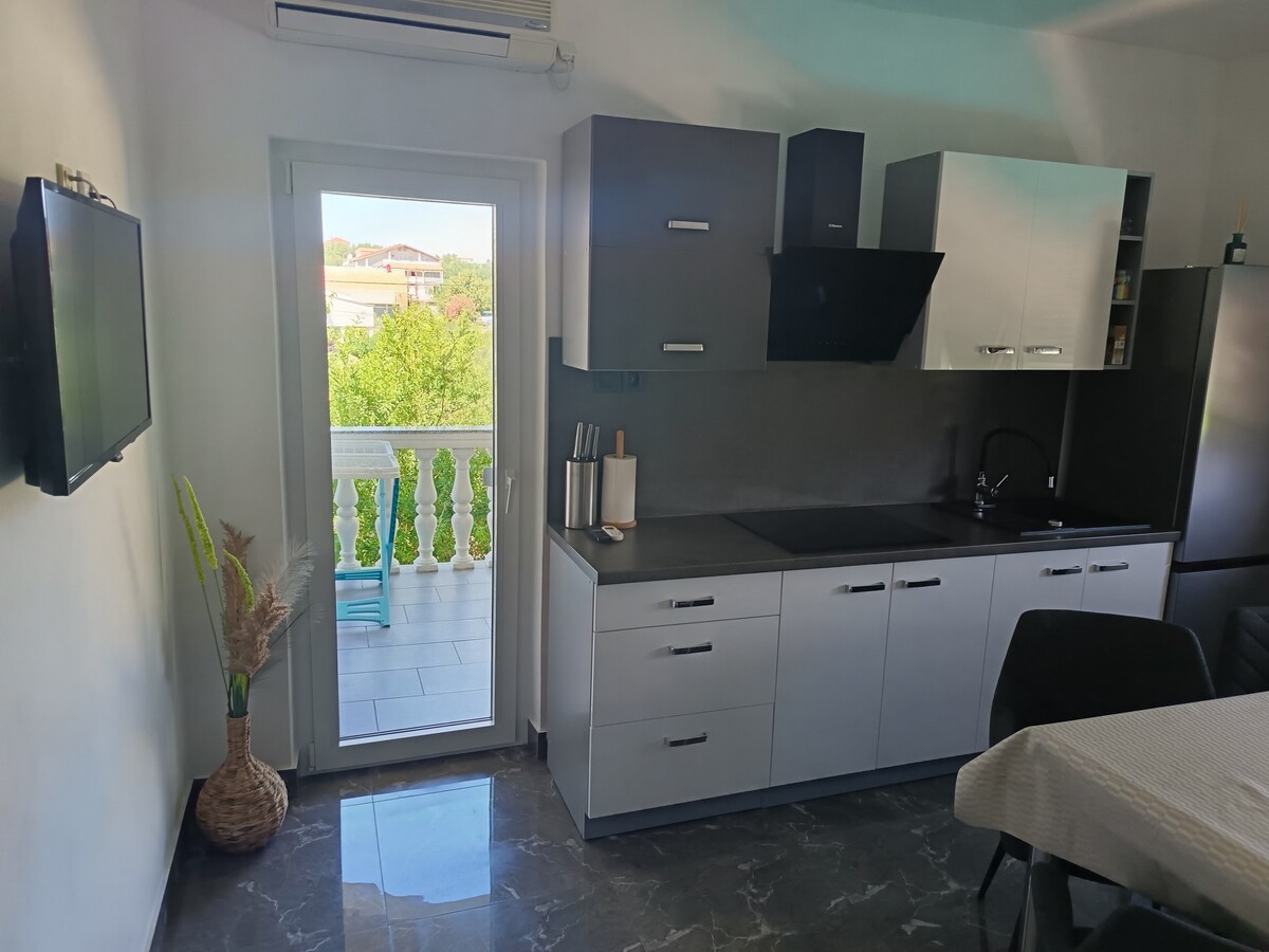 Casa noastră este situată într-o zonă verde liniștită. Apartamentul (pentru maxim cinci persoane) se află la parter, complet echipat și este excelent pentru familiile cu copii sau bebeluși. Vă puteți bucura, de asemenea, într-o curte mare. Distanța de mers pe jos până la cea mai apropiată plajă cu nisip este de 3-4 minute, portul cu promenadă 8 minute.; Ciganka, Sturič, Podšilo plaja 20 min. Supermarketul și poșta sunt la 3 minute de mers pe jos. Cu toate accesoriile dorim să oferim oaspeților noștri o primire perfectă.