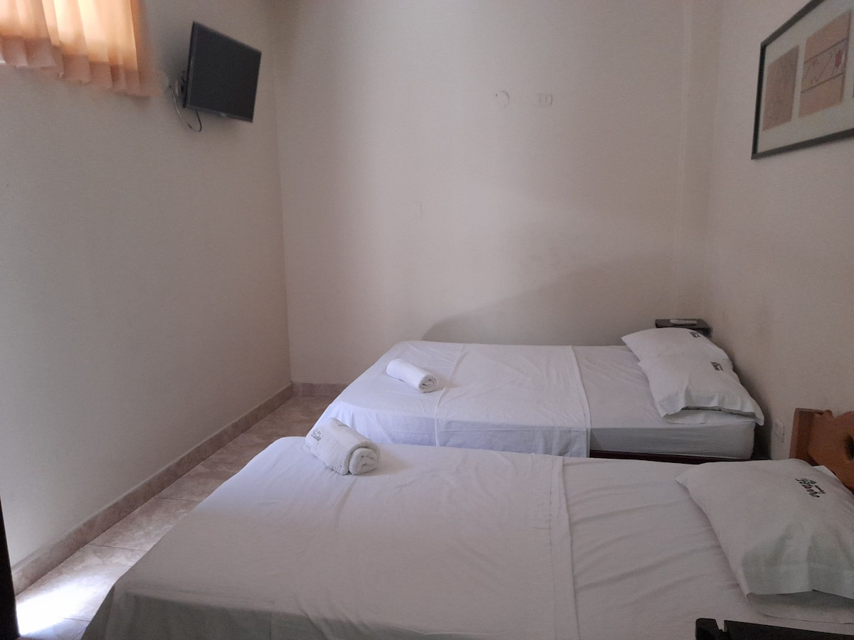 Pat ✔️ matrimonial confortabil, ideal pentru odihnă după o zi de aventură prin cascade și lagune. ✔️ Spațiu ventilat, cu lumină naturală, baie privată și apă caldă. ✔️ Decorațiune caldă cu esență amazoniană care inspiră calm. ✔️ Atmosferă liniștită pentru cuplurile care apreciază curățenia, liniștea și un tratament bun. ✔️ La câțiva pași de centrul orașului Tarapoto, într-o zonă sigură și liniștită. 🌿 Alege o experiență apropiată, naturală și autentică, te va face să te simți ca acasă. 🌿Nu, inclusiv micul-dejun