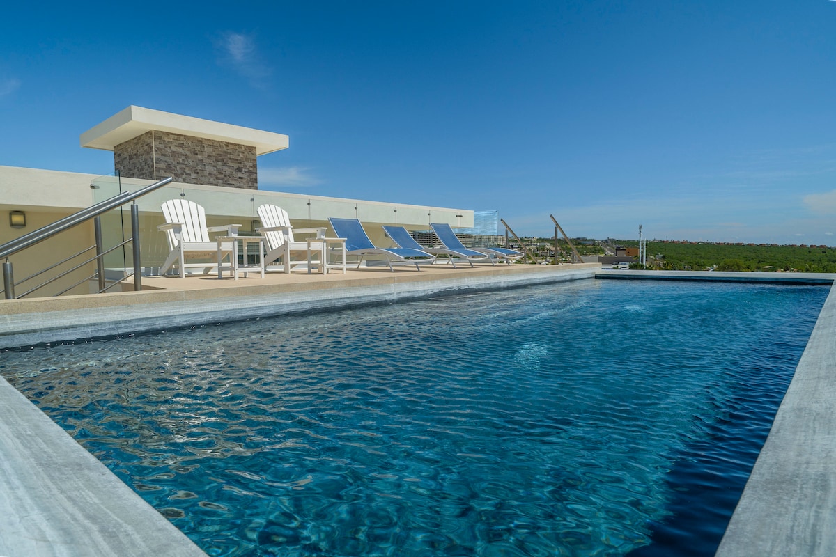 Imaginează-ți asta: cafeaua de dimineață pe acoperișul tău privat, apoi o după-amiază la piscina infinită înainte ca plaja Medano să te cheme. Acest apartament de lux de la ultimul etaj te aduce la 5 minute de agitația din centrul orașului Cabo, dar se simte ca un refugiu pe vârful unei stânci. Familiile se răspândesc în 2 dormitoare, cuplurile revendică vatra de pe acoperiș la apus. Ne-am ocupat de detalii: echipament de plajă pregătit, bucătărie aprovizionată, securitate non-stop. Trebuie doar să vii. Partea grea? Plecarea în ziua de check-out.