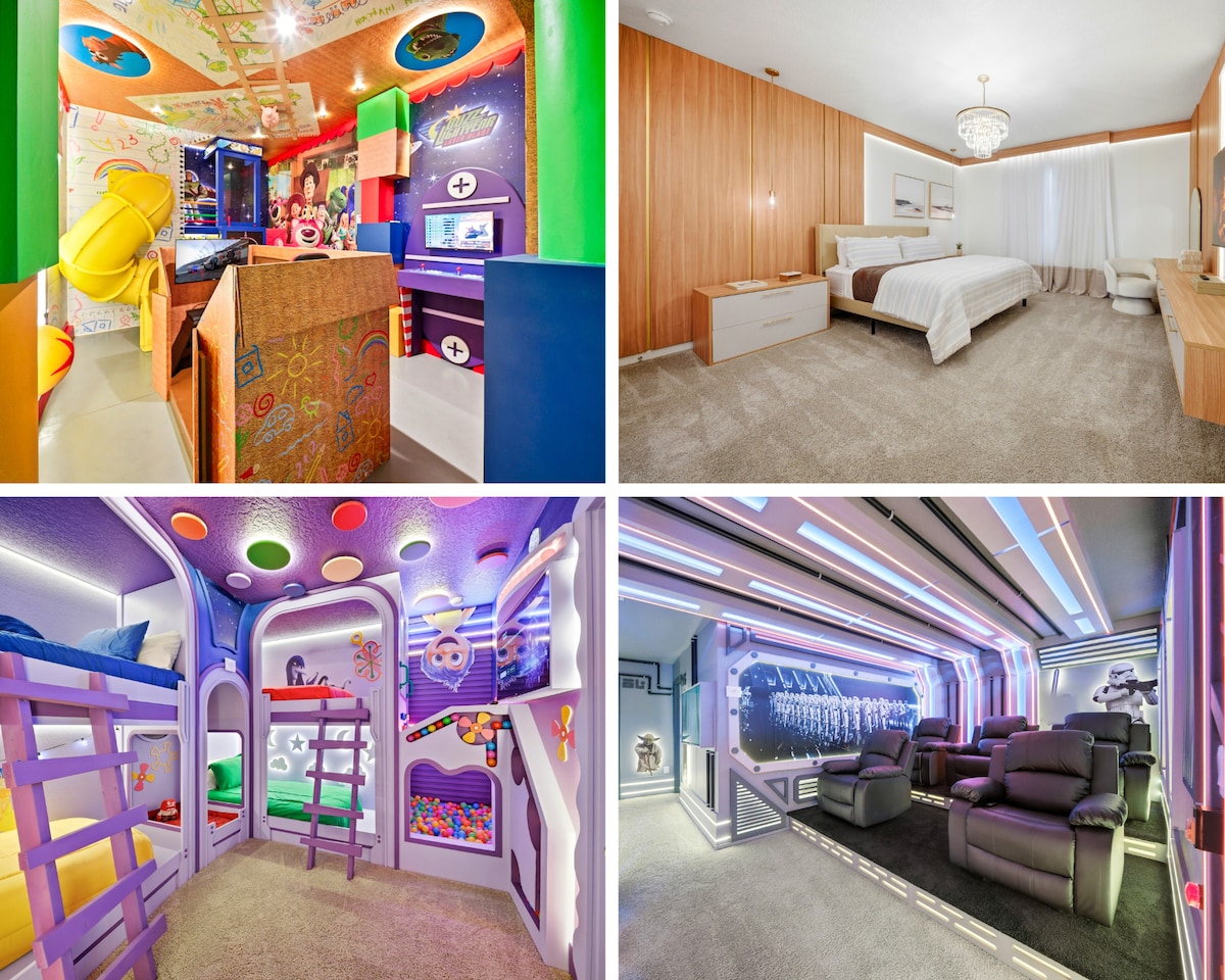 Design elegant, confort luxos și divertisment nesfârșit, cu o terasă cu piscină și bucătărie în aer liber, cu vedere la sud-vest de 2200 ft2, fără vecini în spate într-o pădure frumoasă din uimitorul complex Reunion de 3,5 metri pătrați. Vei avea propria piscină privată cu spa de preaplin, sală de cinema, biliard - sală de jocuri, 4 camere tematice: SPAȚIU EXTERIOR, SUPEREROI MARVEL cu TOBOGAN TUBULAR, ÎNGHEȚAT II, DULAP HARRY POTTER, PS5, în câteva minute până la Disney.