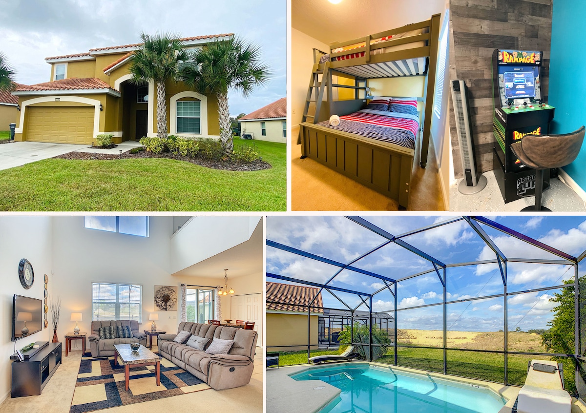 Casă de vacanță complet echipată situată în Davenport FL, la doar 20 de minute de Disney, Universal Studios, Sea World și alte parcuri tematice. Această vilă de familie dispune de piscină privată, sală de jocuri, 4 dormitoare, 3,5 băi, poate primi până la 10 membri ai familiei și prieteni. Ambele dormitoare principale sunt mobilate cu paturi king-size și o baie privată pentru fiecare, al treilea dormitor are două paturi de o persoană, iar al treilea are patru paturi supraetajate. Ultimele două camere au o baie comună. Televizorul este disponibil în toate camerele.