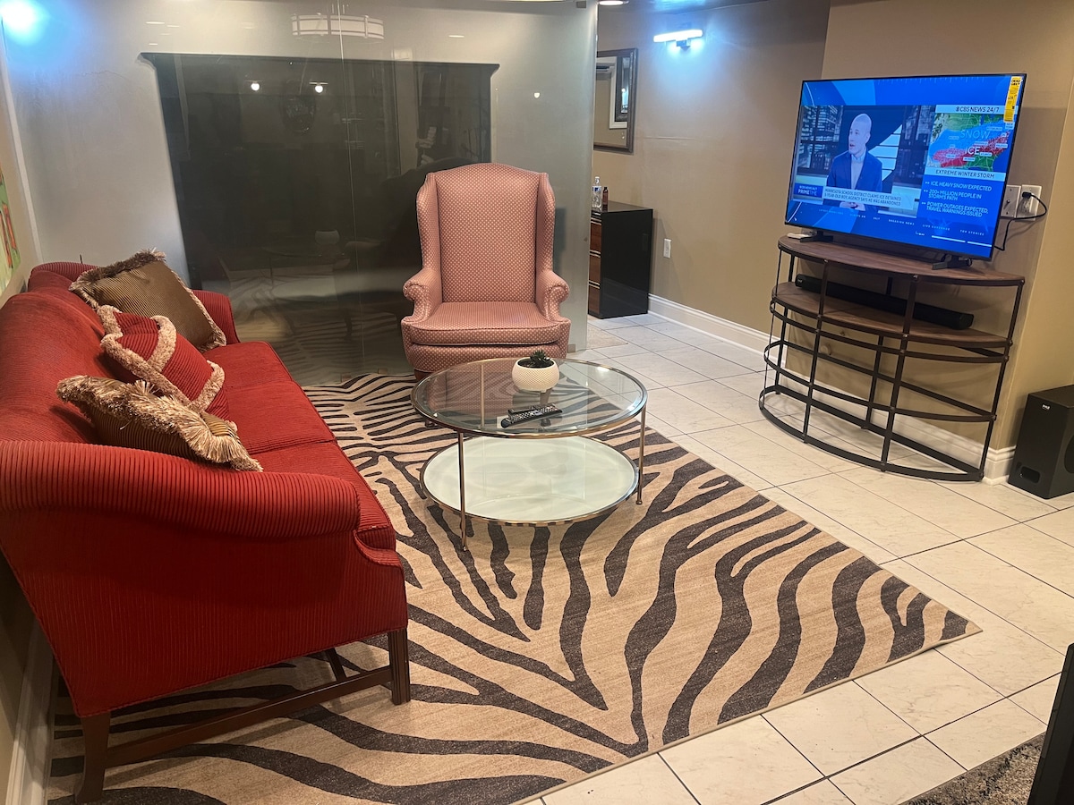 Private, well-lit, entrance is in rear of home. The space is approx. 600sq. ft. There is a gas fireplace, 42" HD TV w/Netflix & Amazon Prime. Kitchen has Keurig coffee maker, convection oven, inferred glass top burner, microwave, refrigerator/freezer w/ice, washer/dryer& a large marble shower, with heated floors in the shower room. Also space equipped w/ Medify air purifier w/H13 true Hepa medical grade filter.