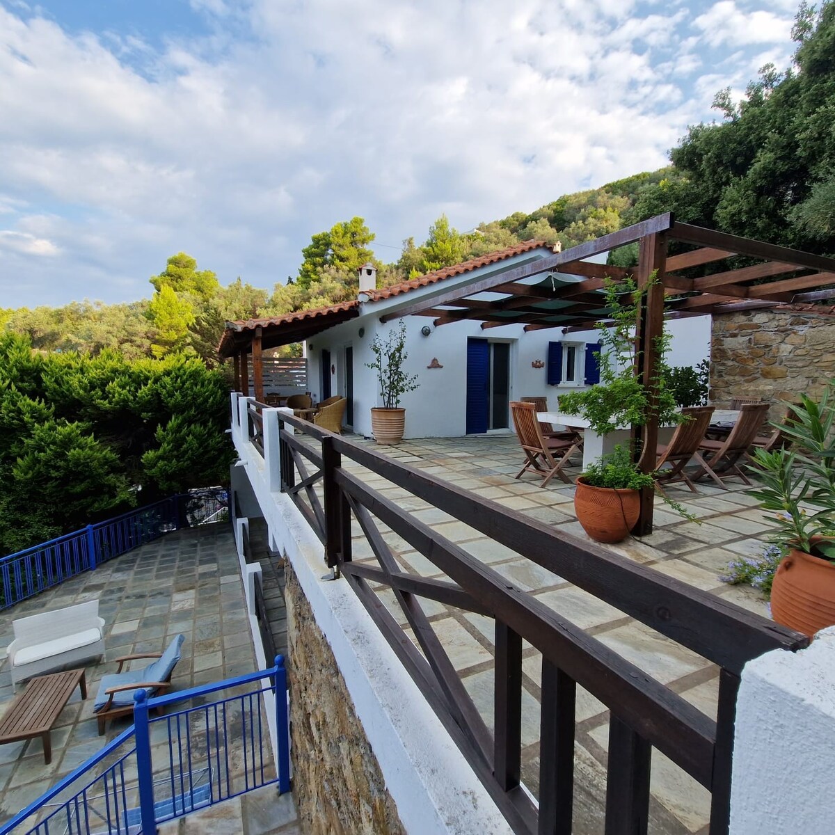 In Trikeri of South Pelion, a fully renovated house, independent & spacious with outdoor spaces, yard & balcony with panoramic views to all points of the horizon. It is located on the channel between the Pagasitic-Evoic gulf and the Aegean Sea & leaves behind it, the forest of Pelion, the Mountain of the Centaurs. Trikeri is a beautiful destination different from the rest of Pelion. It is located at the southernmost tip of Pelion at a distance of 81 km from Volos at an altitude of 300 meters.