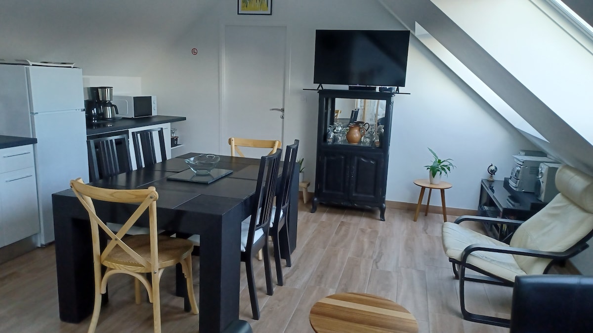 La 15 minute de Laval, acest nou apartament la mansardă de 50 m2 se află la primul etaj al casei . Dispune de: - un living cu bucătărie utilată + o zonă de living. - un dormitor cu un pat dublu 140-190 + un pat de o persoană 120- 190 + un spațiu de birou dedicat. - o zonă separată de dormit cu o canapea extensibilă cu 2 locuri. - o baie + toaletă.