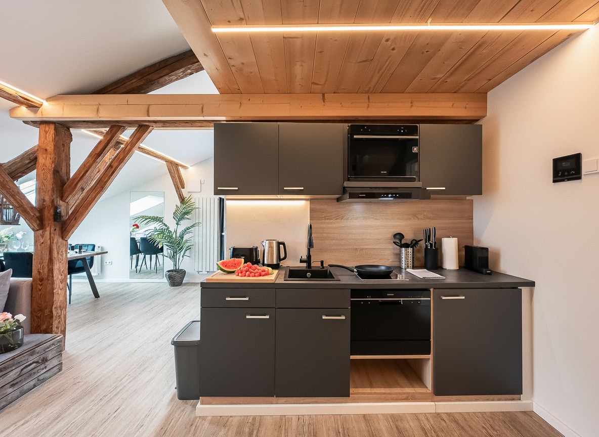 Așteaptă cu nerăbdare un apartament elegant, nou construit, cu o senzație de plan deschis și un pat dublu confortabil. Baia modernă cu duș la nivelul podelei îi oferă o atmosferă de hotel, în timp ce bucătăria complet utilată cu zonă de luat masa te face să te simți ca acasă.