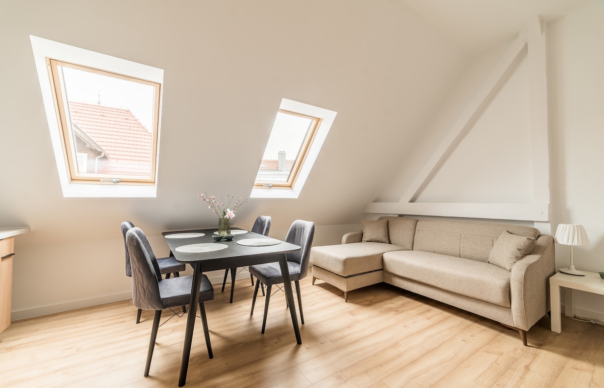 Un apartament de 60 de metri - situat la primul etaj al unei case unifamiliale. Stilul modern al apartamentului combinat cu elemente tradiționale creează întregul perfect pentru 2-4 persoane, iar toate dotările pentru oaspeți sunt oferite pentru a se simți ca acasă. Apartamentul are o ușă interioară, oferind un apartament separat pentru pace și liniște. Apartamentul are, de asemenea, un balcon dotat cu o masă și două scaune. Loc de parcare alocat apartamentului Aștept cu nerăbdare vizita ta, Paulina 🌞😉