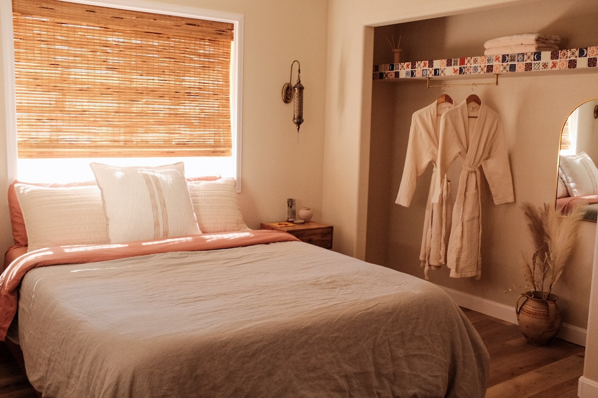 Locuința noastră liniștită, plină de lumină, din anii 1960, are vedere panoramică peste sute de acri de deșert neatins. Am proiectat și creat acest spațiu relaxant pentru noi înșine, astfel încât să nu fie un airbnb tipic. :) Simte-te ca și cum ai fi la un milion de mile distanță în acest refugiu retras, având în același timp acces rapid la tot ce este în zonă: la doar 10 minute de mese și cumpărături în Valea Yucca sau Joshua Tree. Și la doar 15 minute de intrarea principală în Joshua Tree Park sau de Pioneertown.⚡️ Animalele DE companie sunt binevenite!